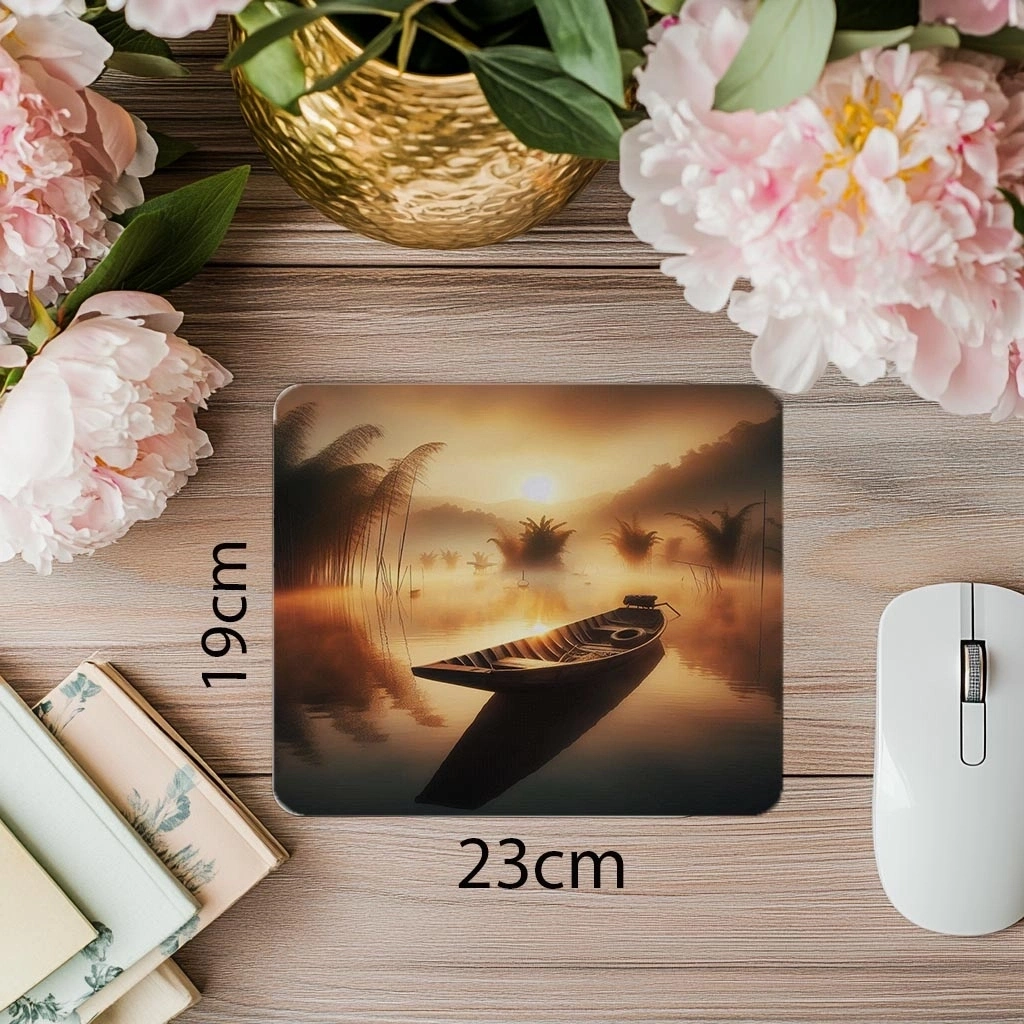 Sakin göl yüzeyinde yüzen kayık figürüyle tasarlanan bu mousepad, doğanın huzur veren sessizliğini masa başınıza taşır.