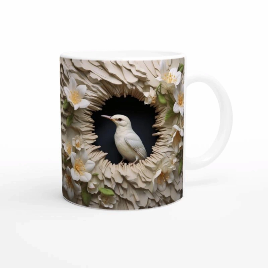 Krem kabartmalı duvar fonunda oyuklardan bakan zarif beyaz albino kuş ve çevresini saran zarif zambak çiçekleri, doğanın sade ve dingin yüzünü kupa tasarımına taşıyor.