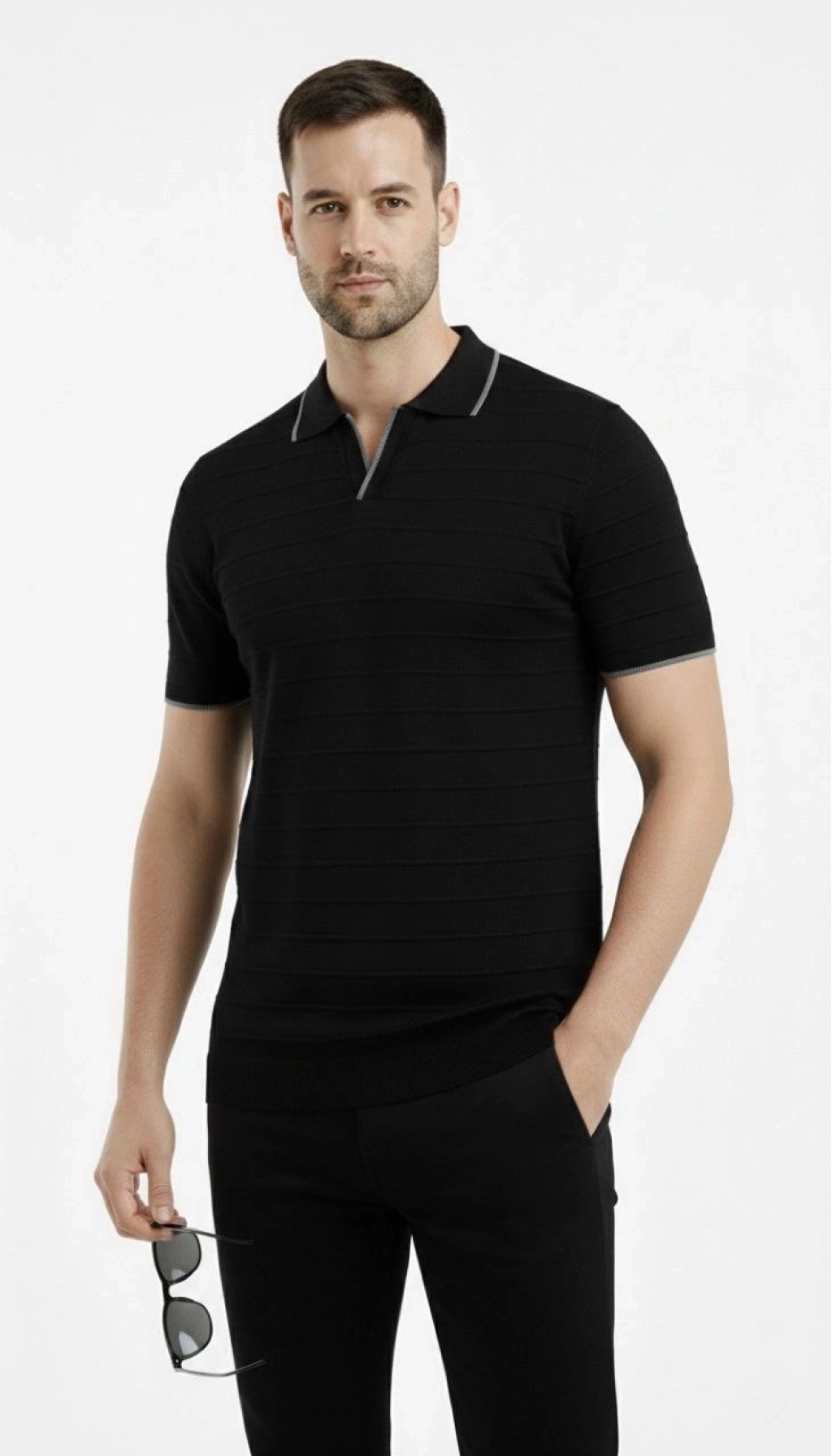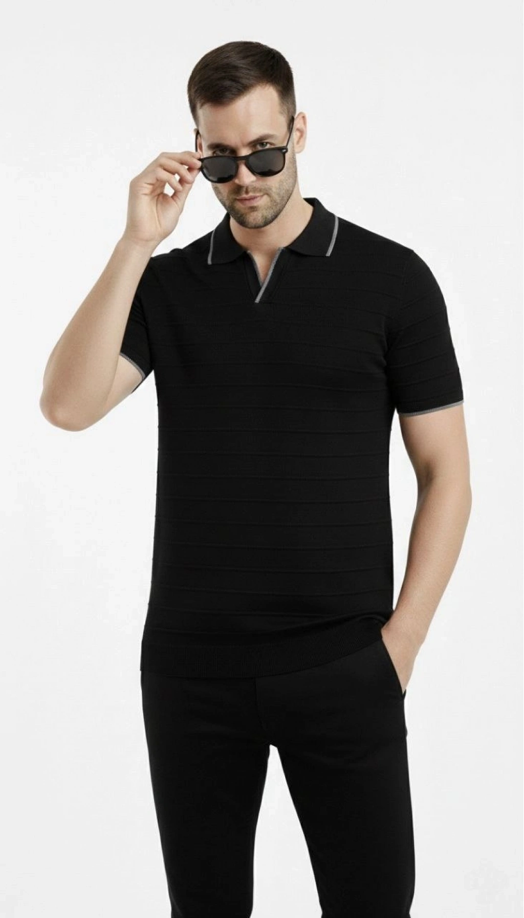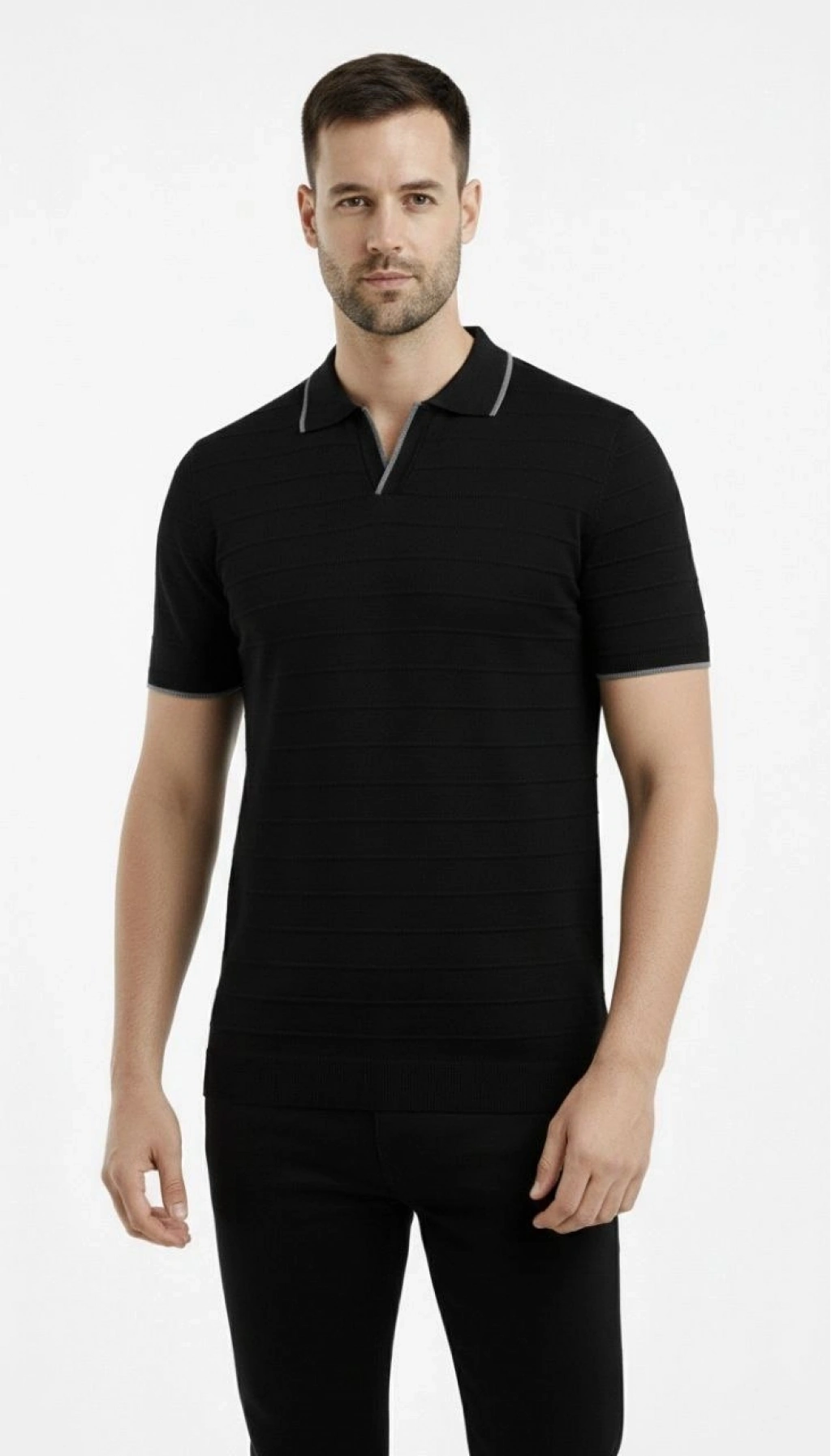 Erkek 2’li Paket Triko Yakalı Düğmesiz Açık Yaka Fitilli Kısa Kollu Regular Fit Tişört - Beyaz Siyah