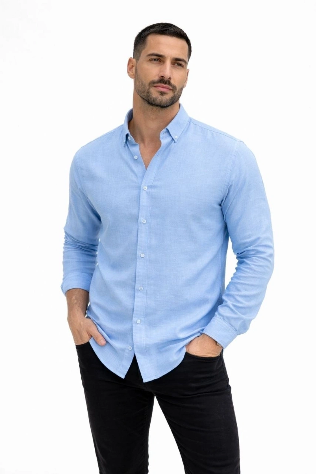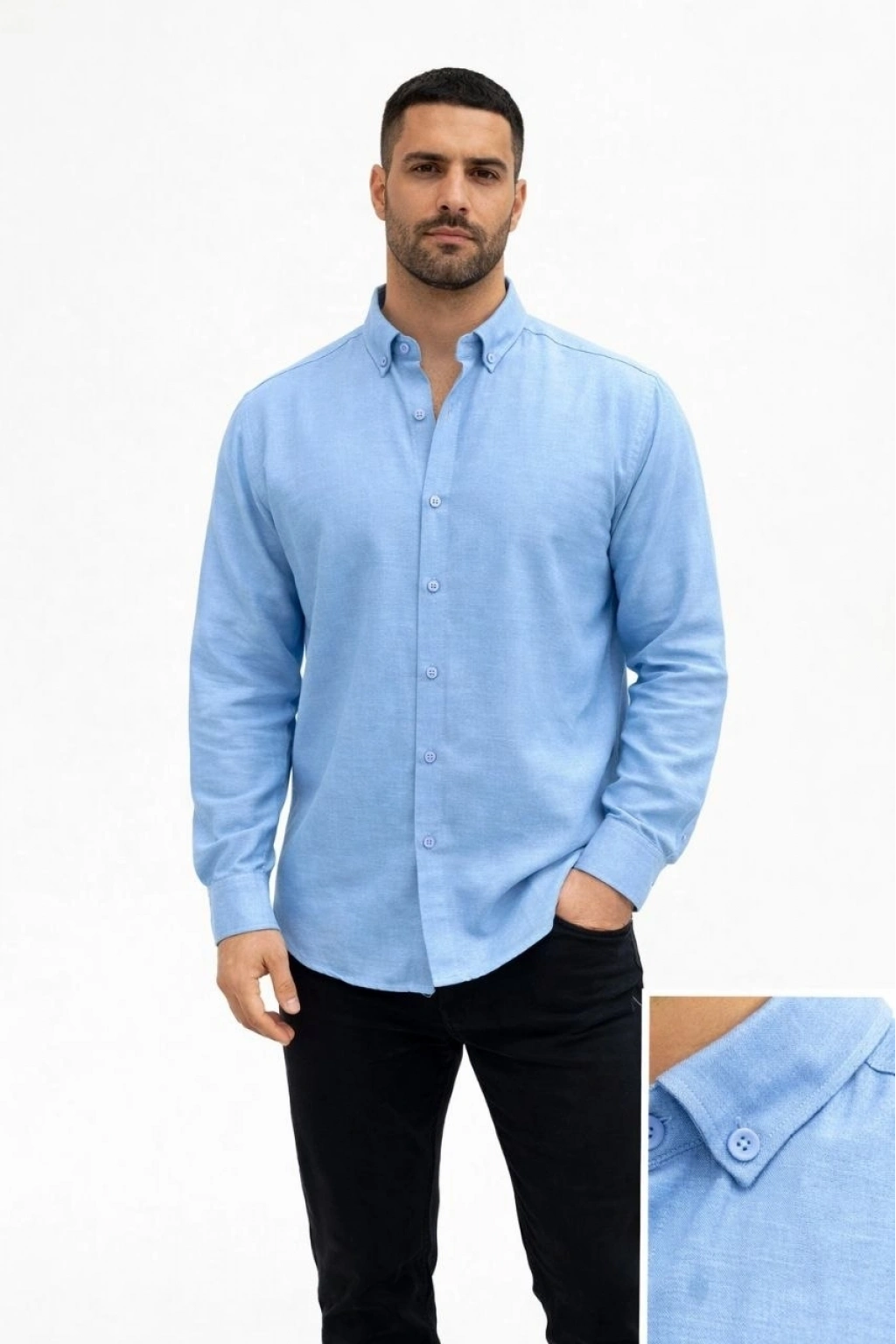 Erkek KETEN Kumaş Oversize Uzun Kollu Rahat Kalıp Gömlek - Açık Mavi