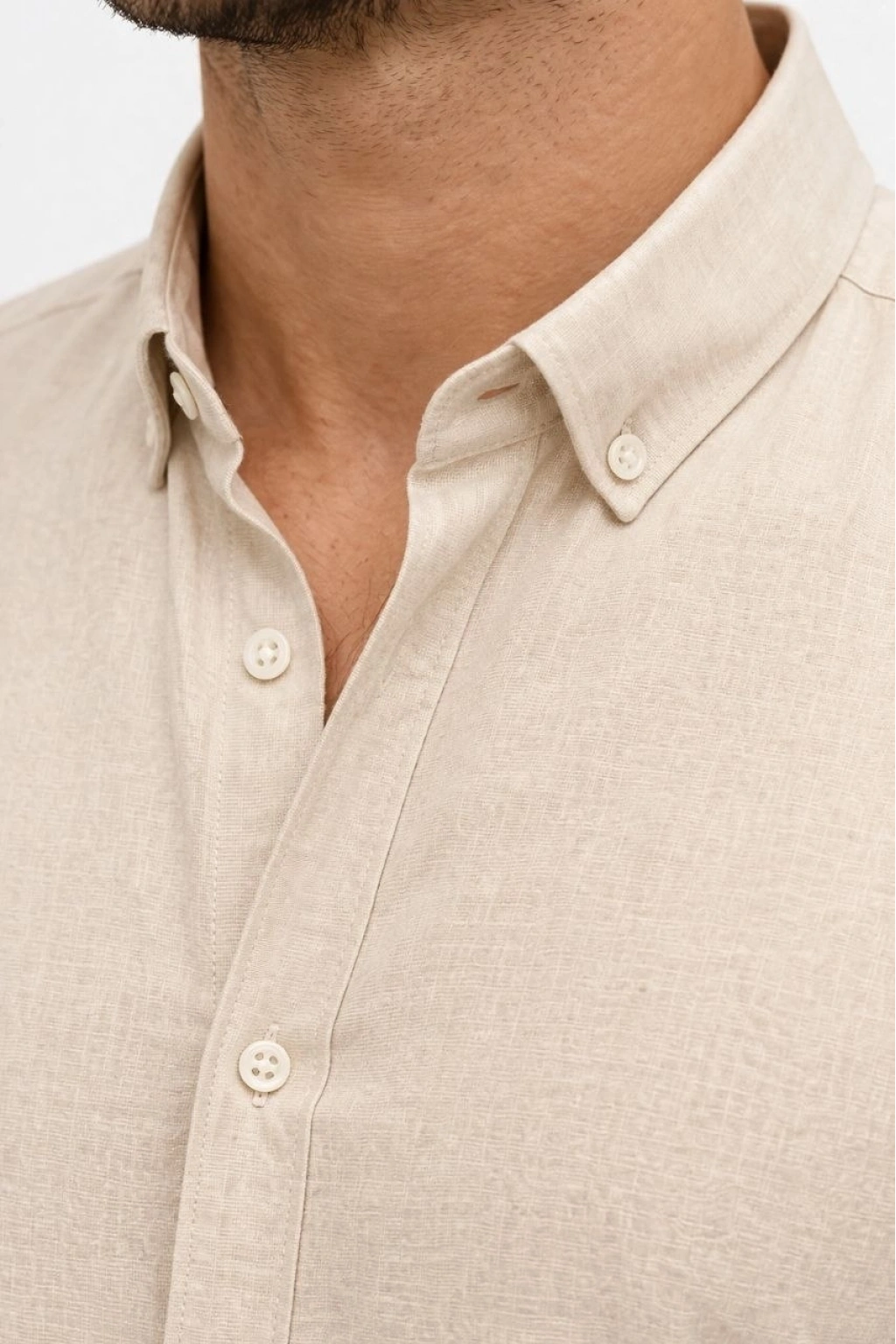 Erkek KETEN Kumaş Oversize Uzun Kollu Rahat Kalıp Gömlek - Bej