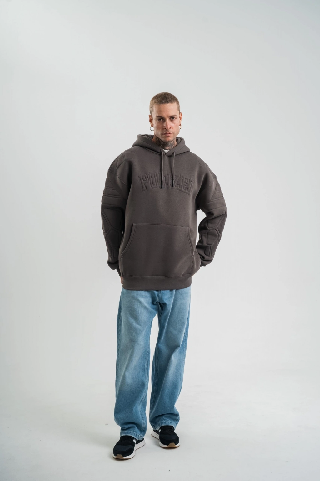 Erkek Nakış İşlemeli Kapşonlu Antrasit Sweatshirt Üç İplik Double Oversize- Füme