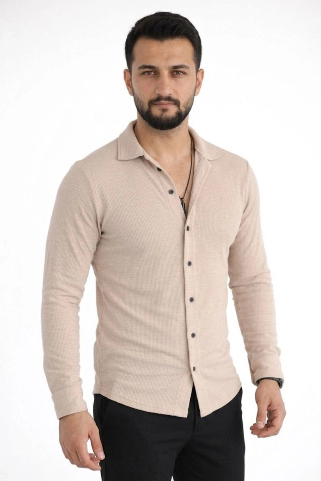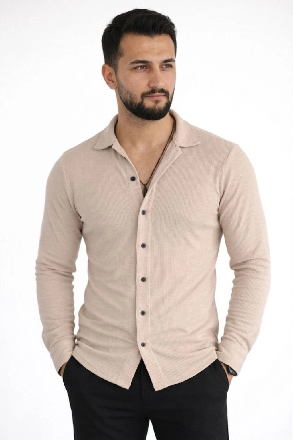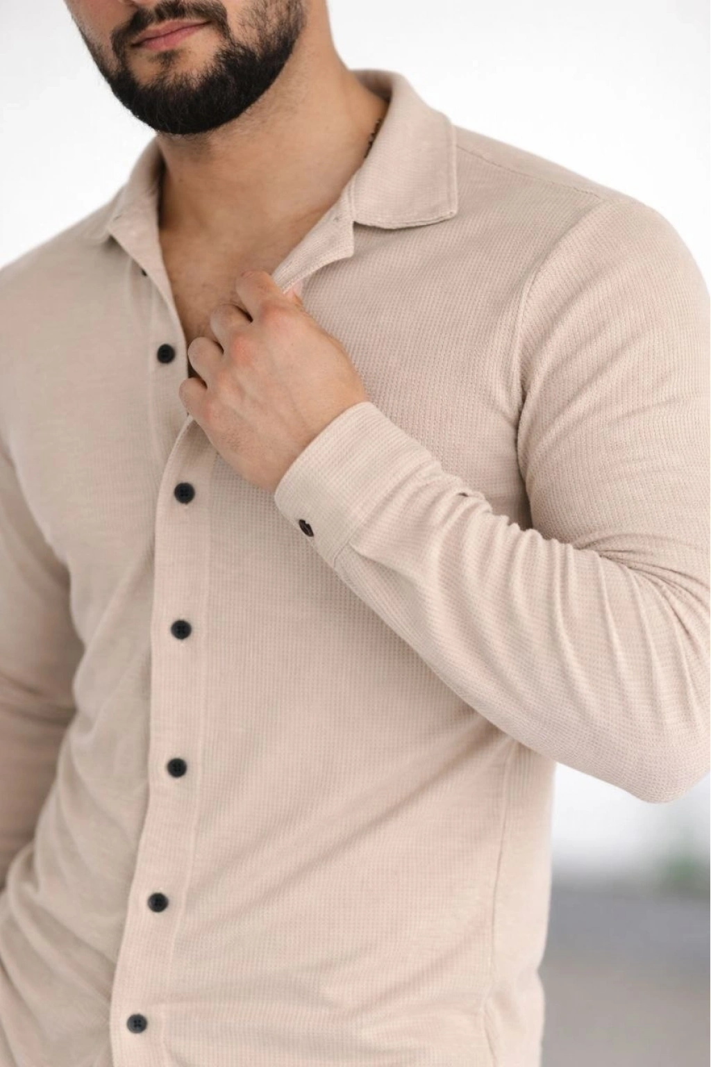 Erkek Waffle Kumaş Uzun Kollu Düğmeli Açık Yaka Regular Fit Gömlek - Bej