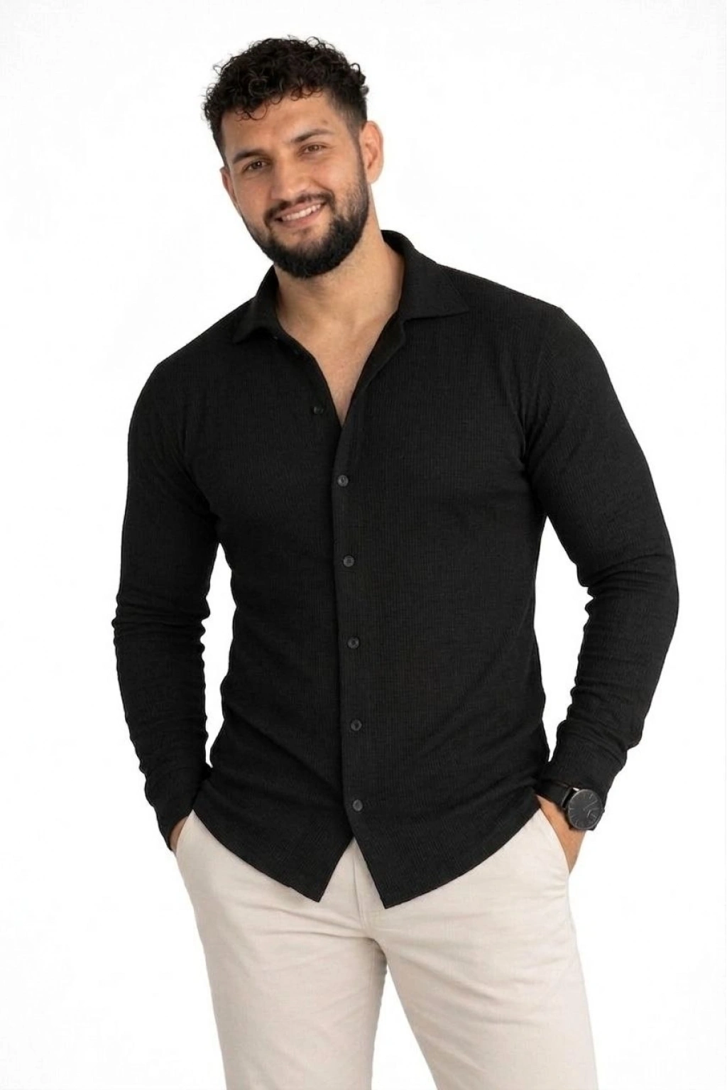Erkek Waffle Kumaş Uzun Kollu Düğmeli Açık Yaka Regular Fit Gömlek - Siyah