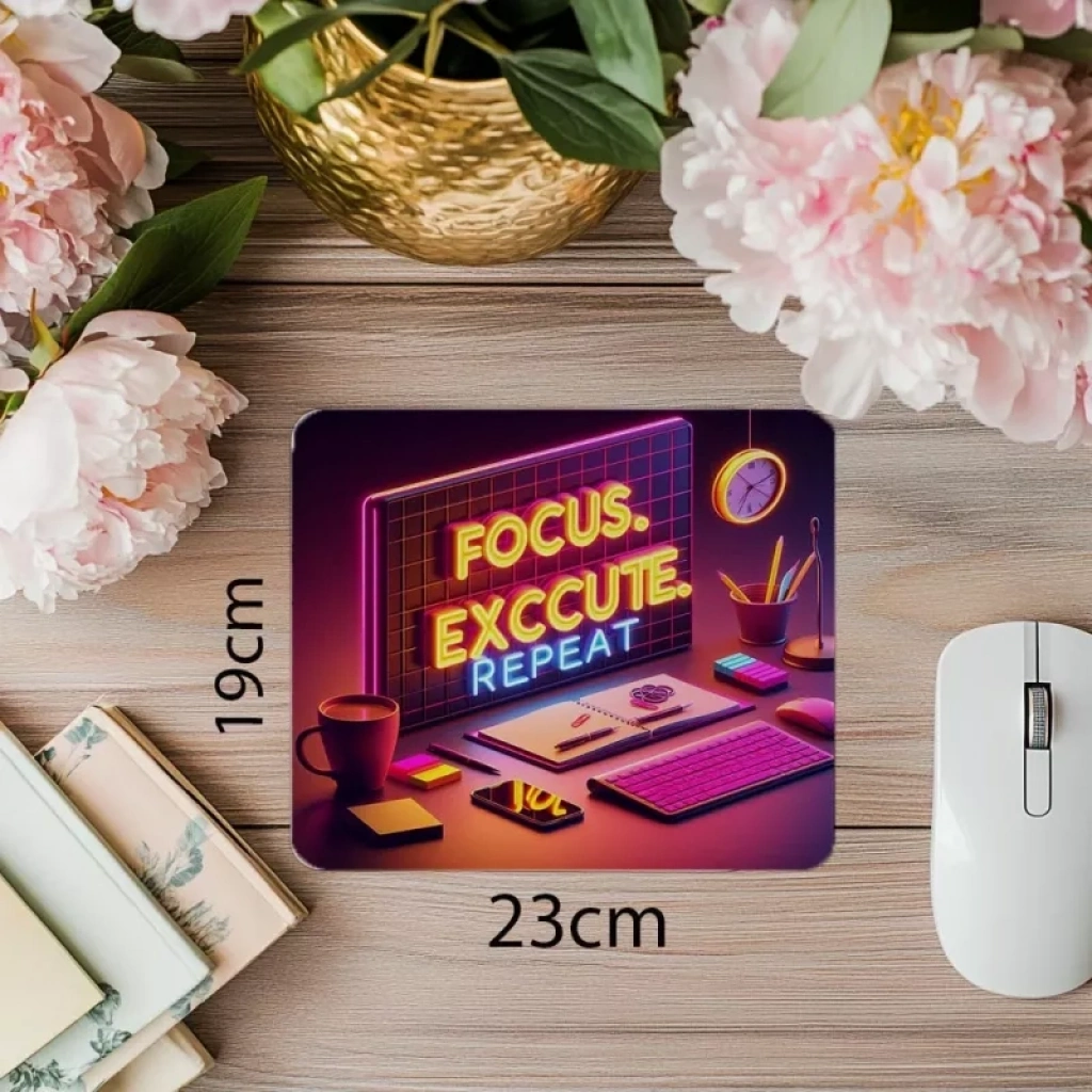 Focus Execute Repeat temalı renkli motivasyon mousepad, canlı renk paleti ve vurgulu kod motifleriyle üretkenliği destekler; pürüzsüz kaydırma yüzeyi ve kaymaz alt zeminle şık ve işlevsel bir kullanım sunar.