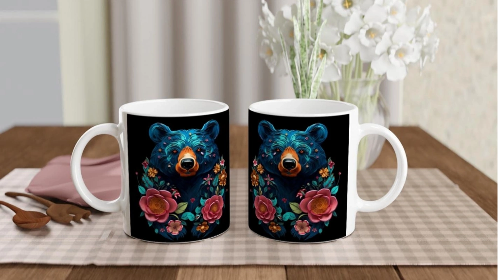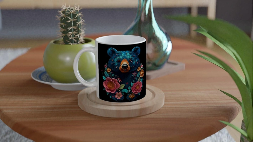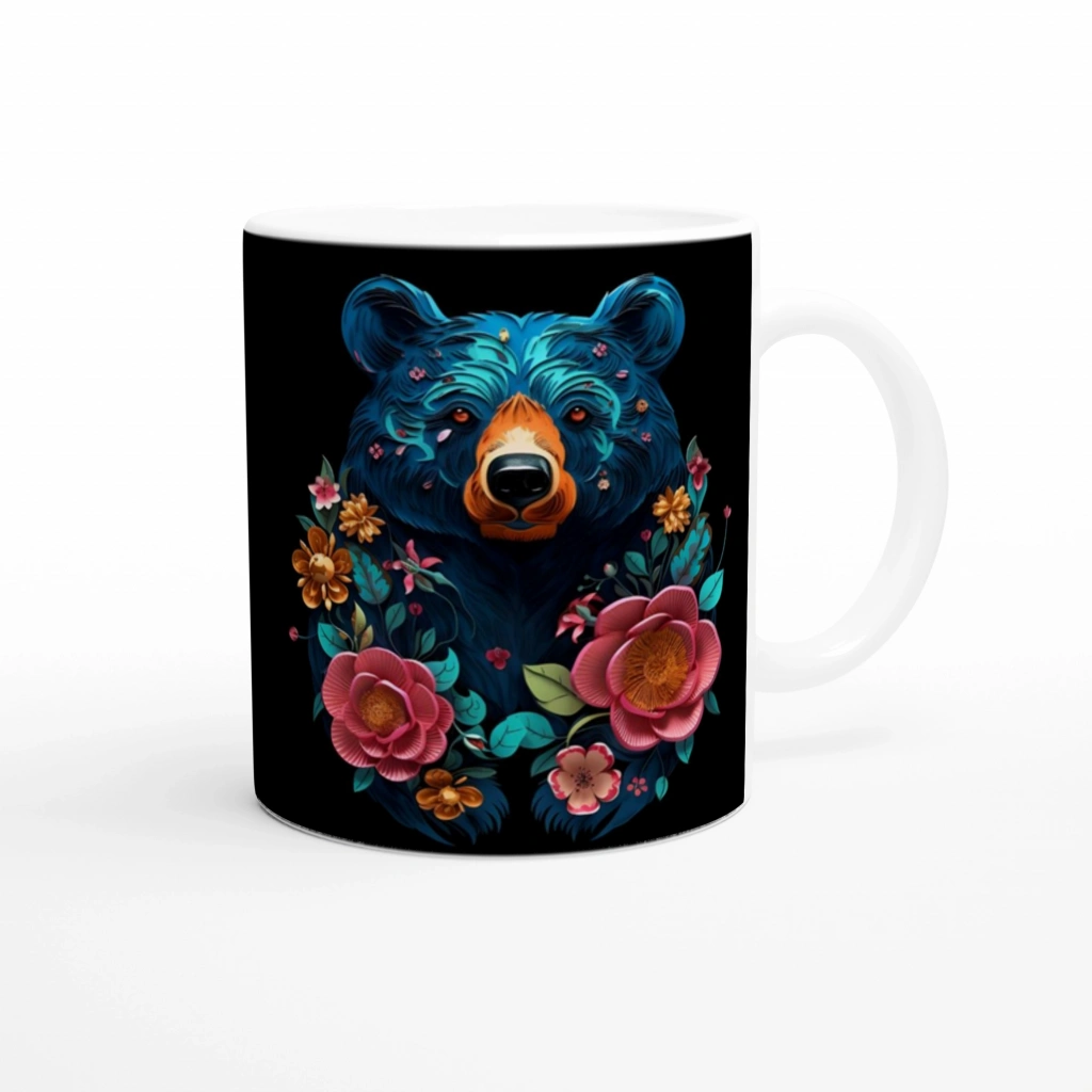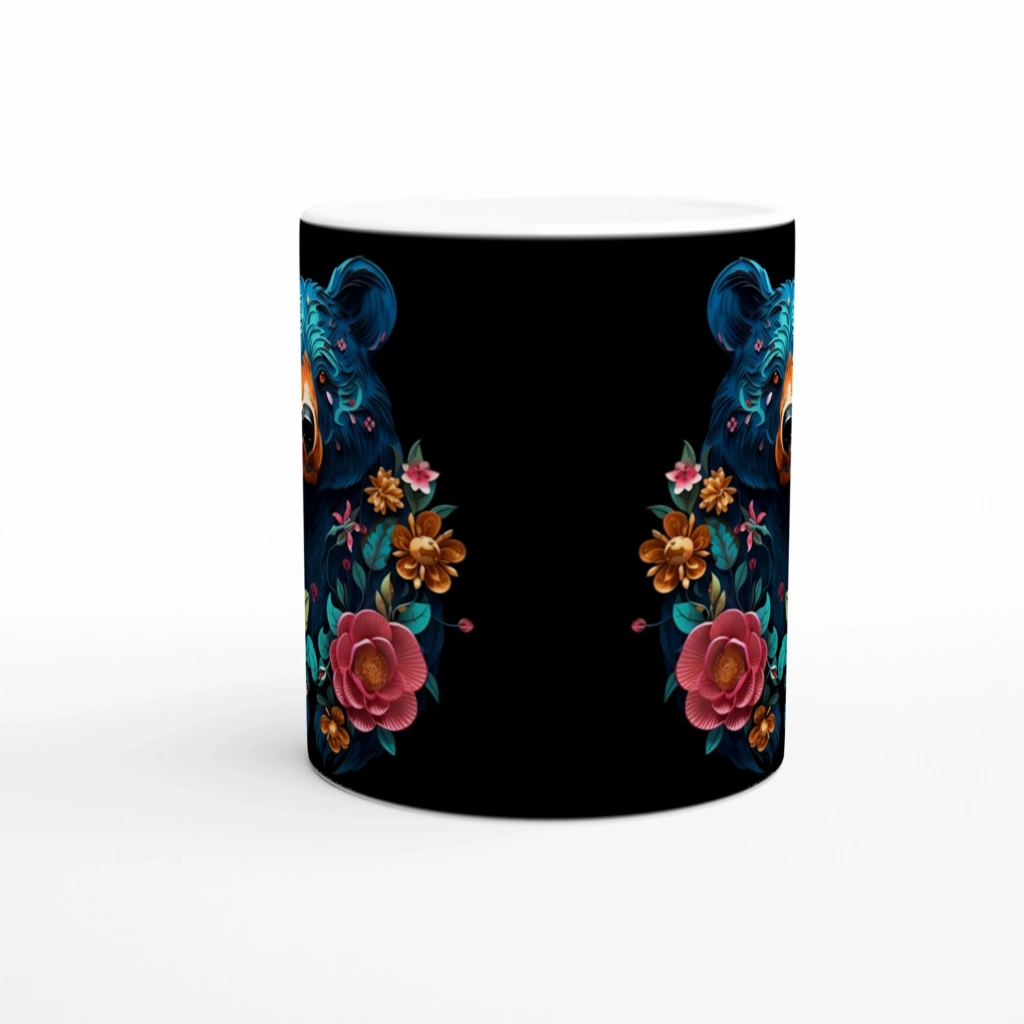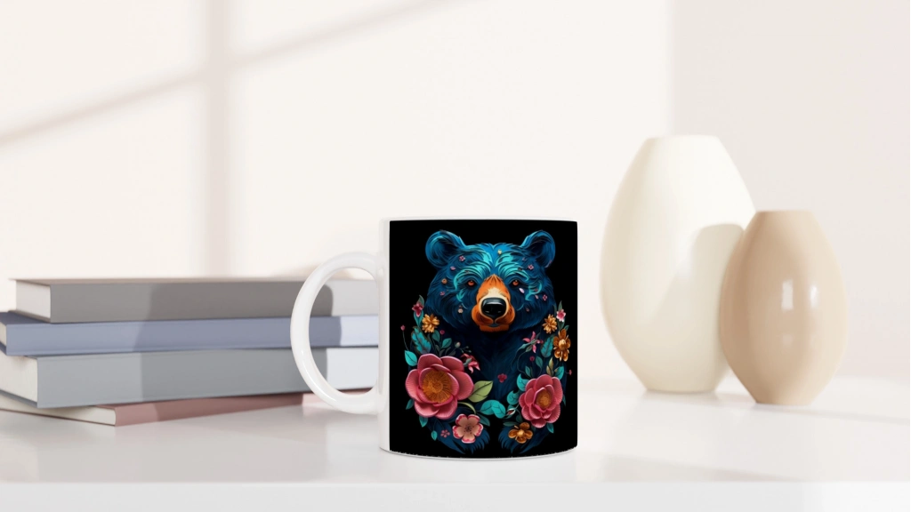 Gizemli ve zarif! Bu çiçeklerle süslenmiş gece mavisi ayı figürlü kupa, doğanın güçlü ve hassas yönlerini bir arada sunuyor.