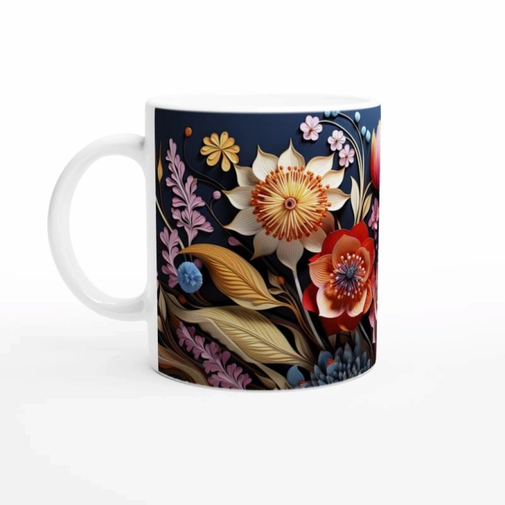 Gece Bahçesi Çiçekli Kupa Bardak, kontrast renkleriyle hem sofistike hem enerjik bir çay-kahve deneyimi sunar.