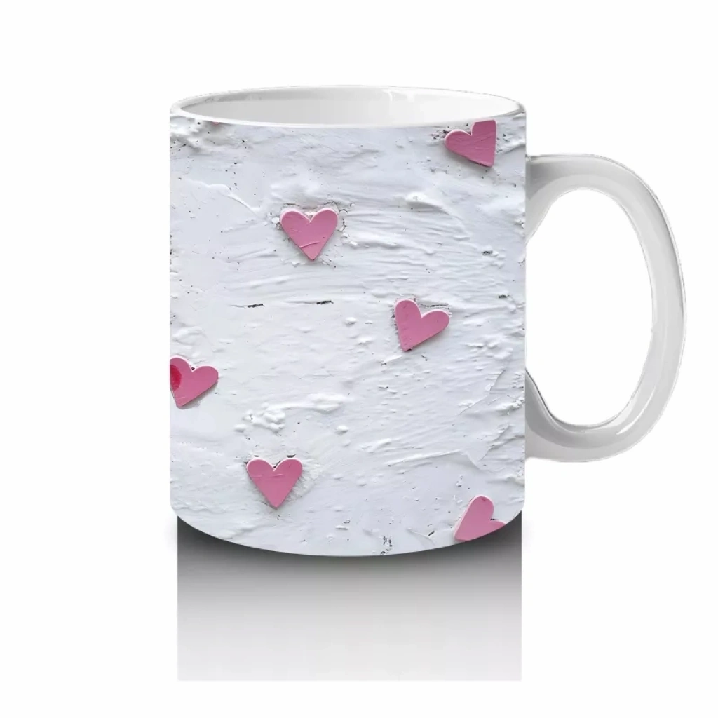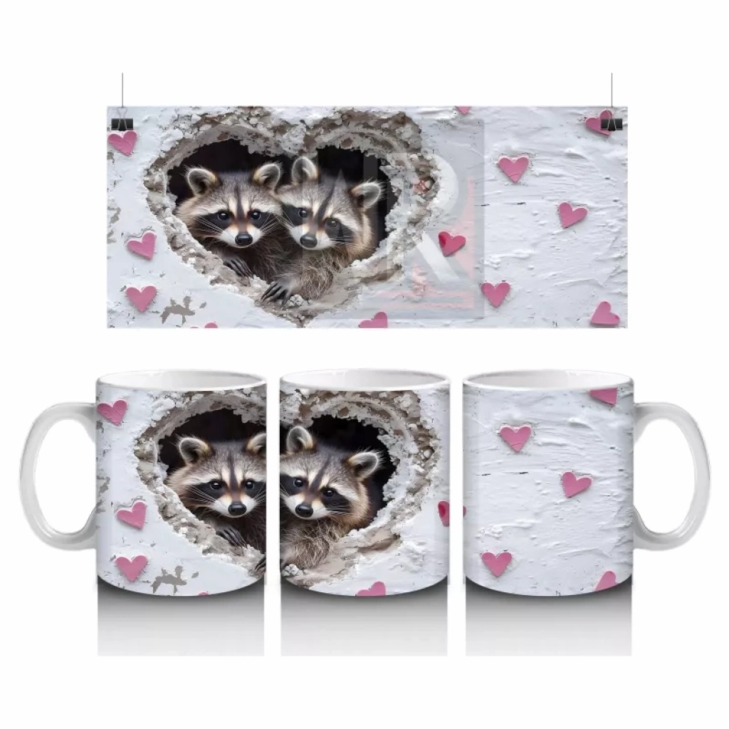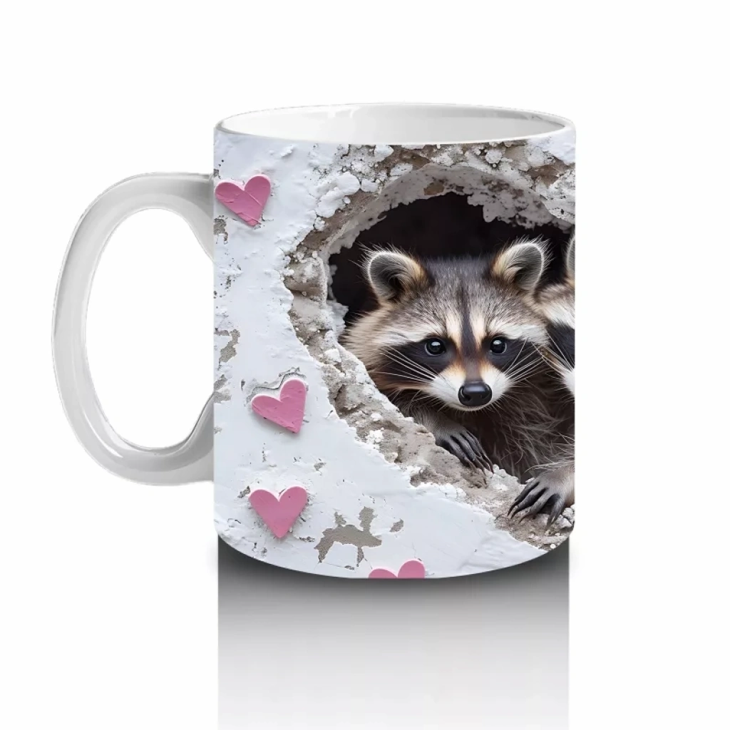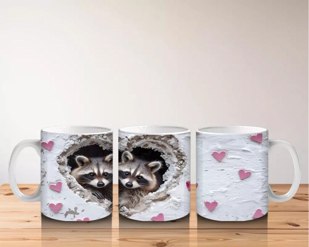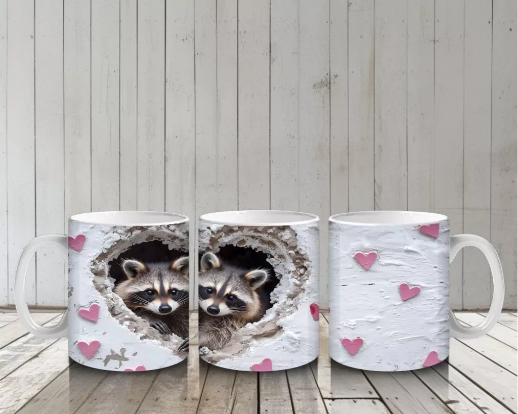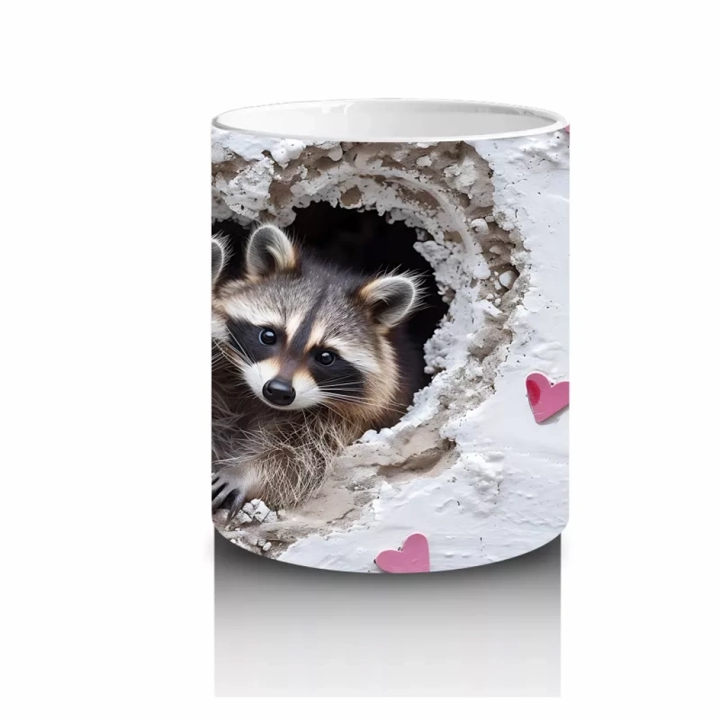 Gri kürk detaylarıyla sevimli rakun, kalplerle çevrelenerek sıcak ve içten bir görüntü sunuyor. Doğal ve samimi tasarımları sevenler için huzur dolu bir kupa tasarımı.
