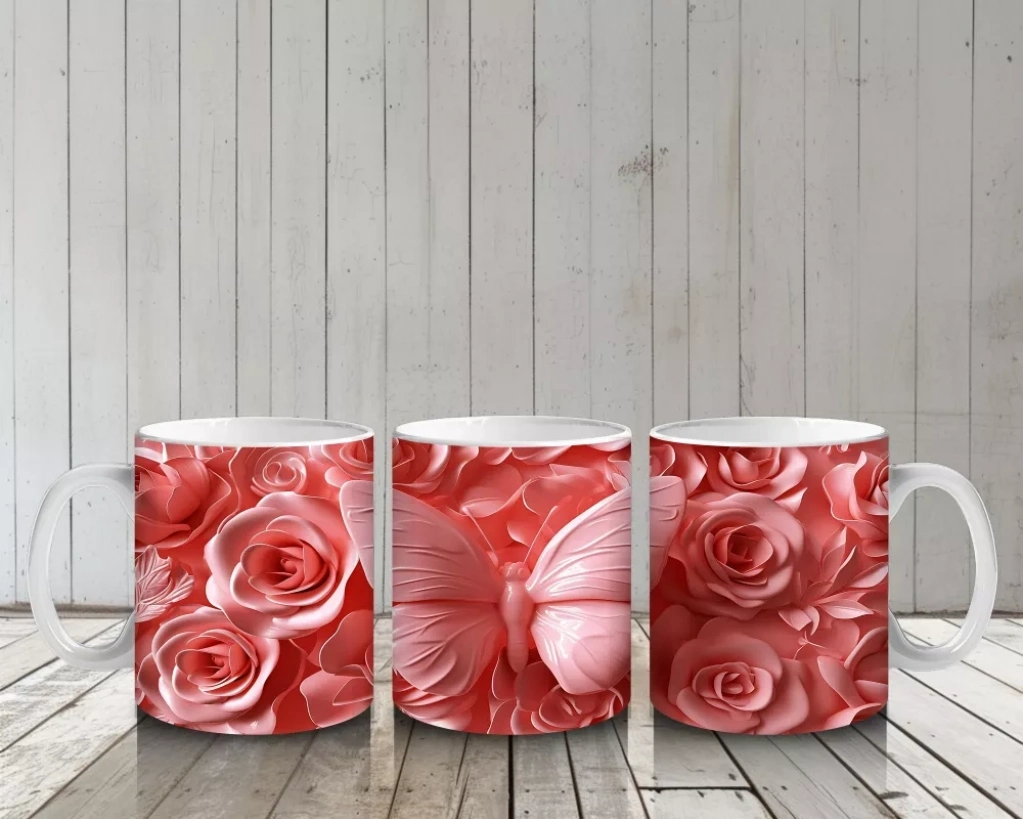 Gül Buketi Arasında Pembe Kelebek – Baskılı Kahve Kupası