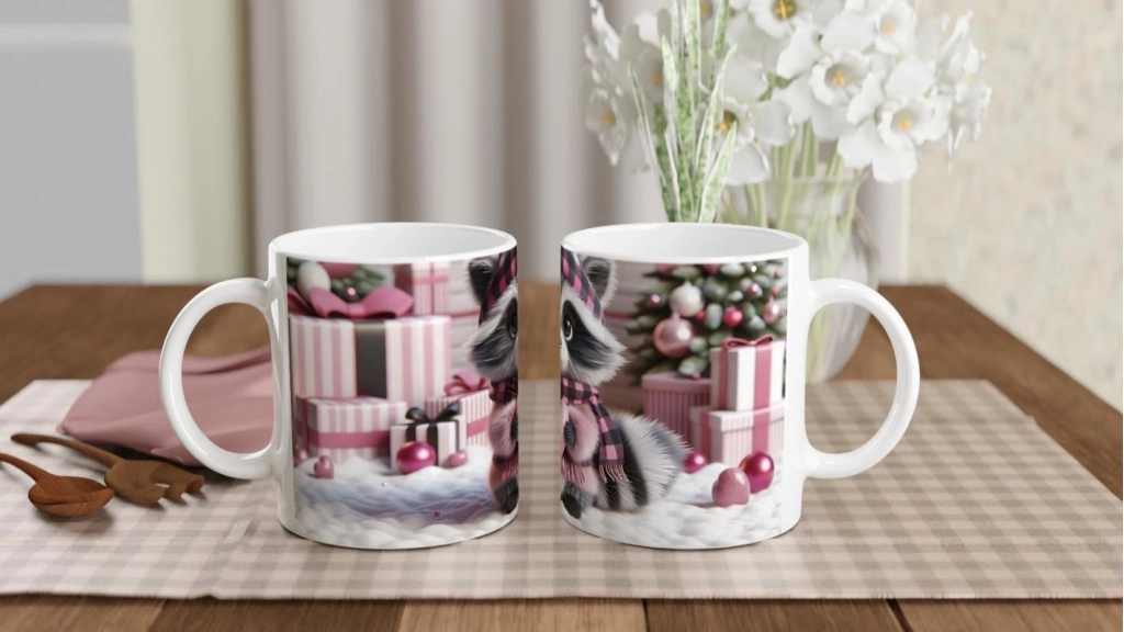 Hediye Kutuları Arasında Kalpli Tembel Hayvan Temalı Baskılı Kupa Bardak, karlarla kaplı zemini, pembe ağırlıklı hediye kutuları ve kalpli süslemeleriyle sıcak kış temalarını romantik bir stille buluşturuyor. Sevgi dolu sürprizler ve özel gün hediyeleri için şirin ve unutulmaz bir seçenek.