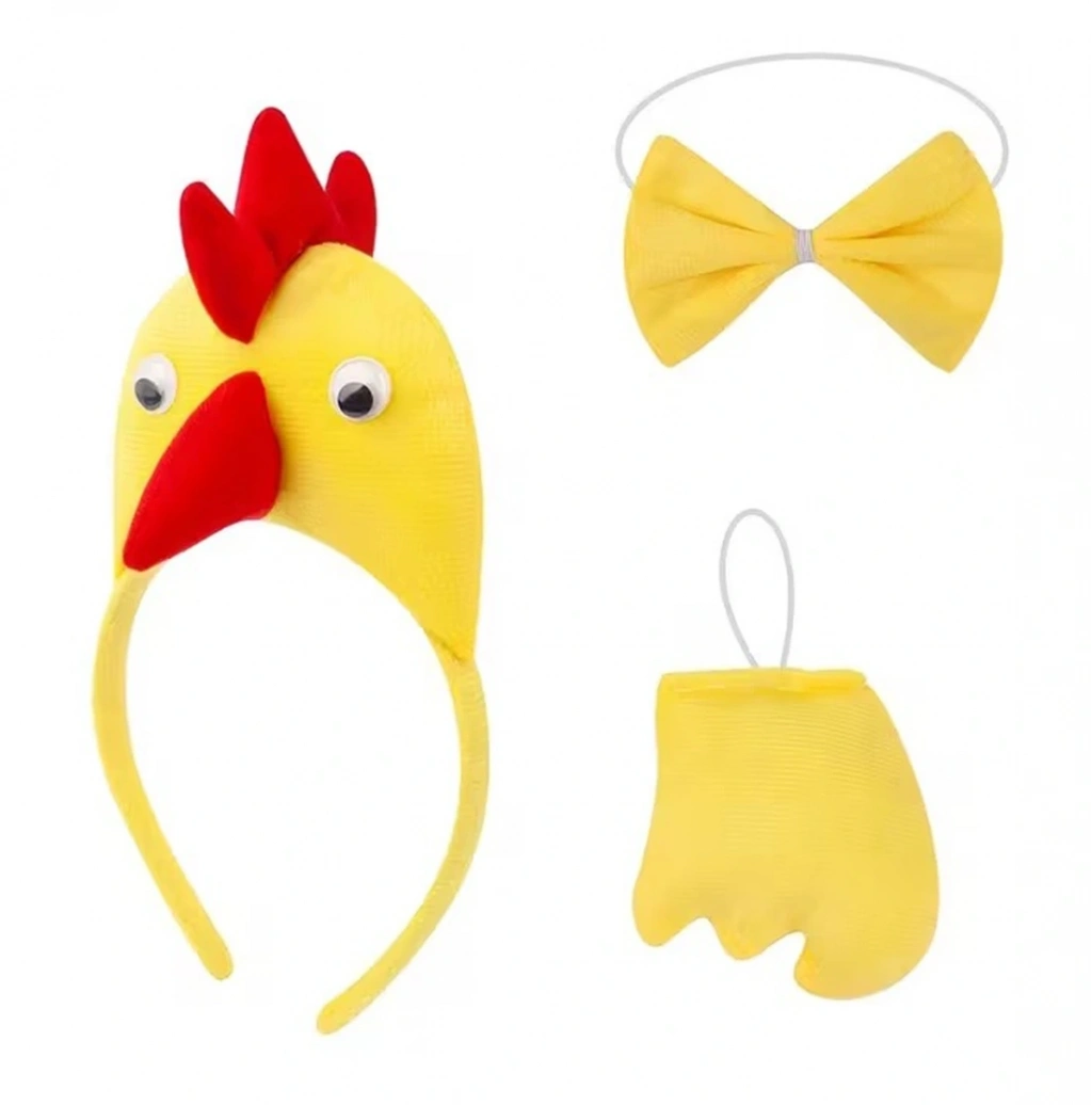 Canlı sarı renkleri ve eğlenceli horoz/tavuk figürü sayesinde çocukların üzerinde dikkat çekici ve neşeli bir görünüm sunar. Sahne gösterileri, tiyatro oyunları, temsiller ve fotoğraf çekimleri için ideal bir kostüm aksesuar setidir.