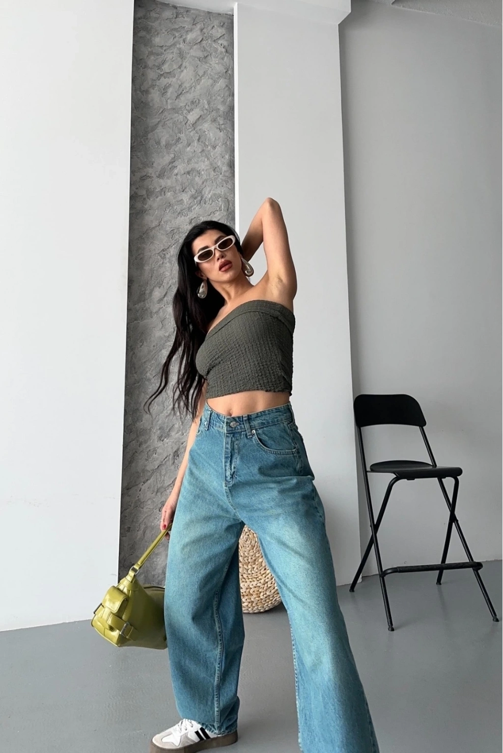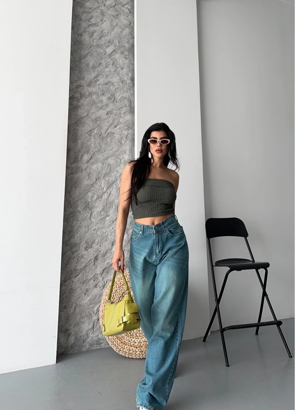 Kadınlar için şıklığı ve rahatlığı bir arada sunan Baggy taş enzim bıyık yıkama jeans pantolon yeşil tint d2007, gardırobunuzun vazgeçilmezi olmaya aday.