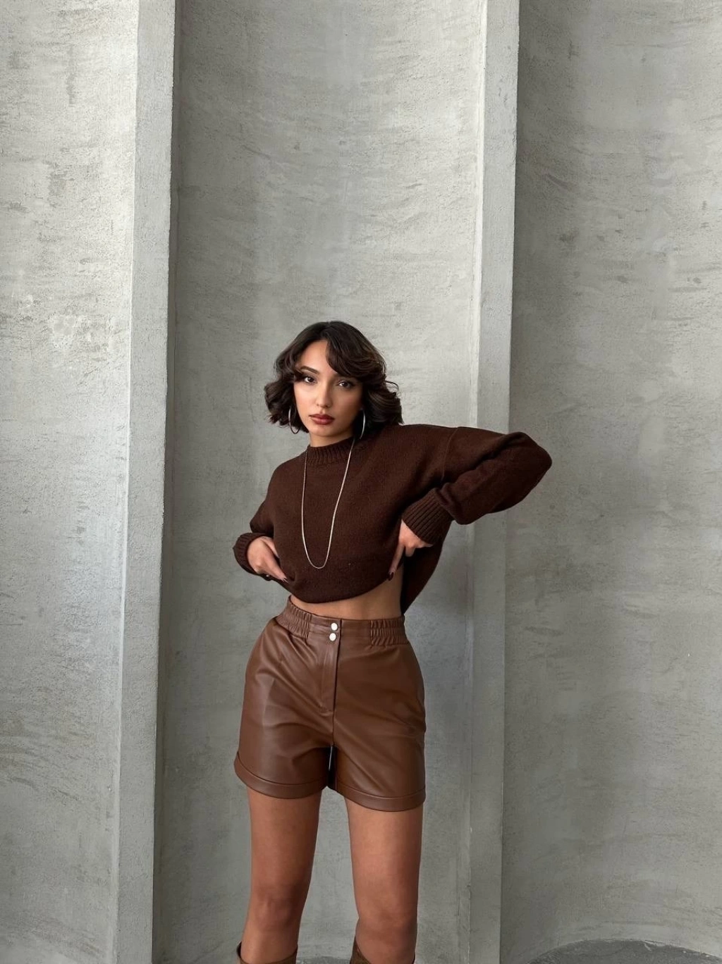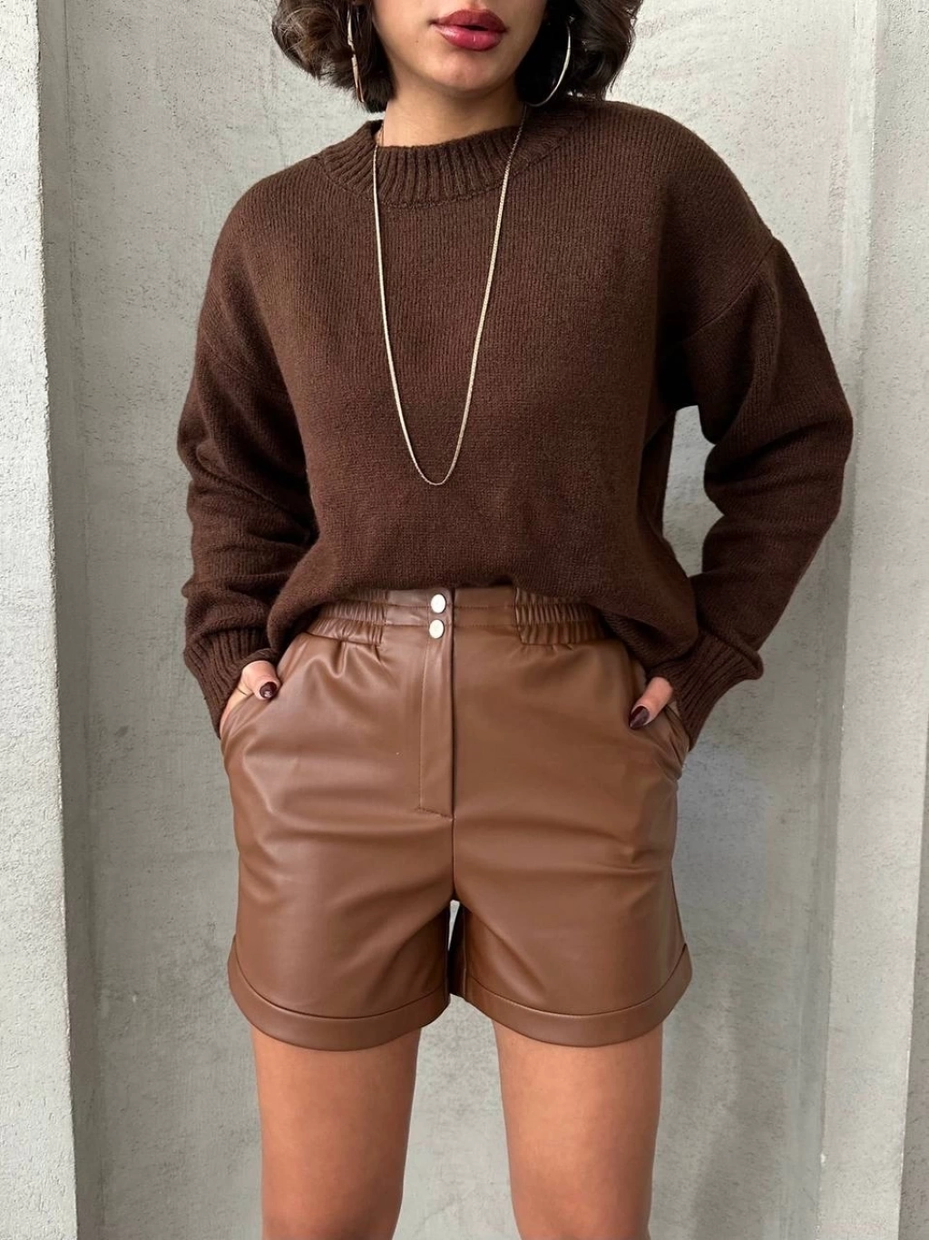 TAVSİYE EDİLEN GÜVENLİ SATICI Beli lastikli çıtçıtlı deri şort kahve w241007