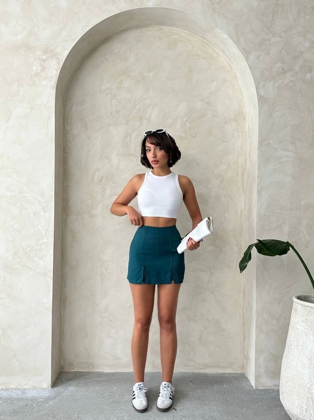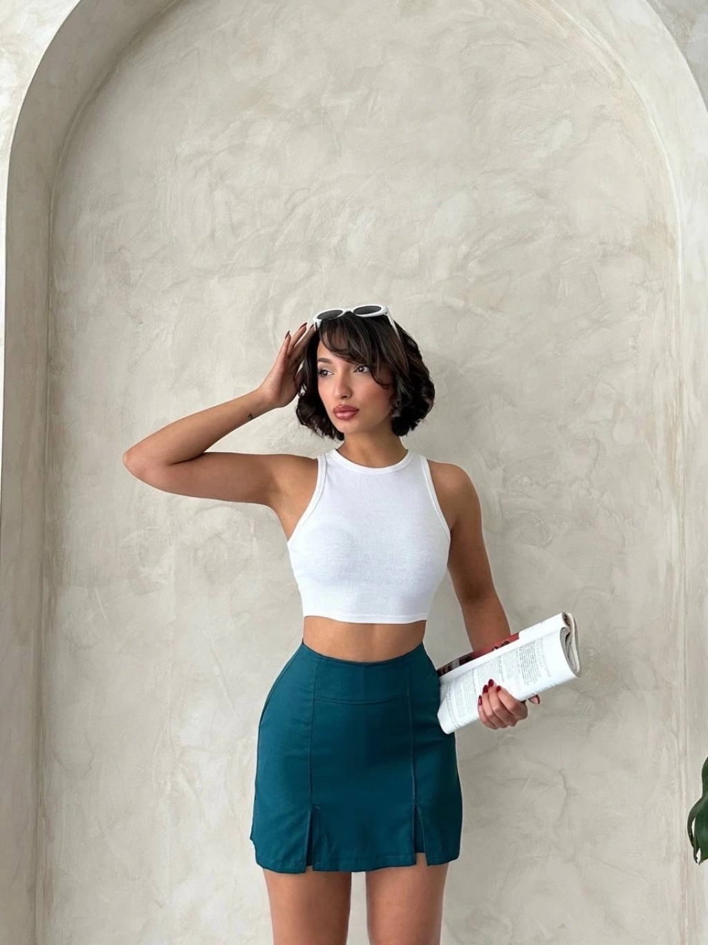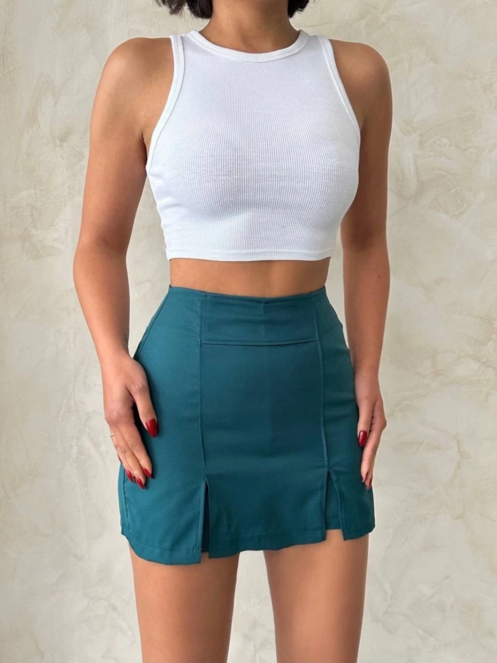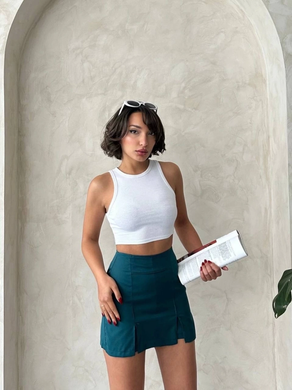 Çift yırtmaç detayına sahip olan atlas şort etek, şık tasarımı ile dikkat çekiyor. Petrol yeşili rengi ile yaz aylarının enerjisini yansıtan bir görünüm sunuyor.