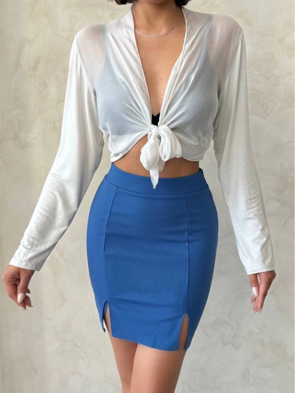 Çift Yırtmaçlı Etek Indigo S25910'u şimdi keşfedin ve gardırobunuza şıklık katın!