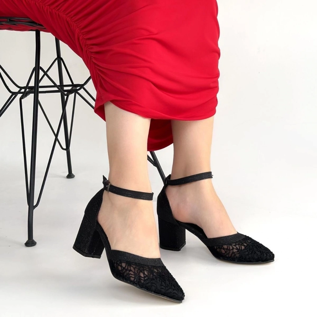 Dmop Siyah Cilt Simli Tül Detaylı Topuklu Ayakkabı