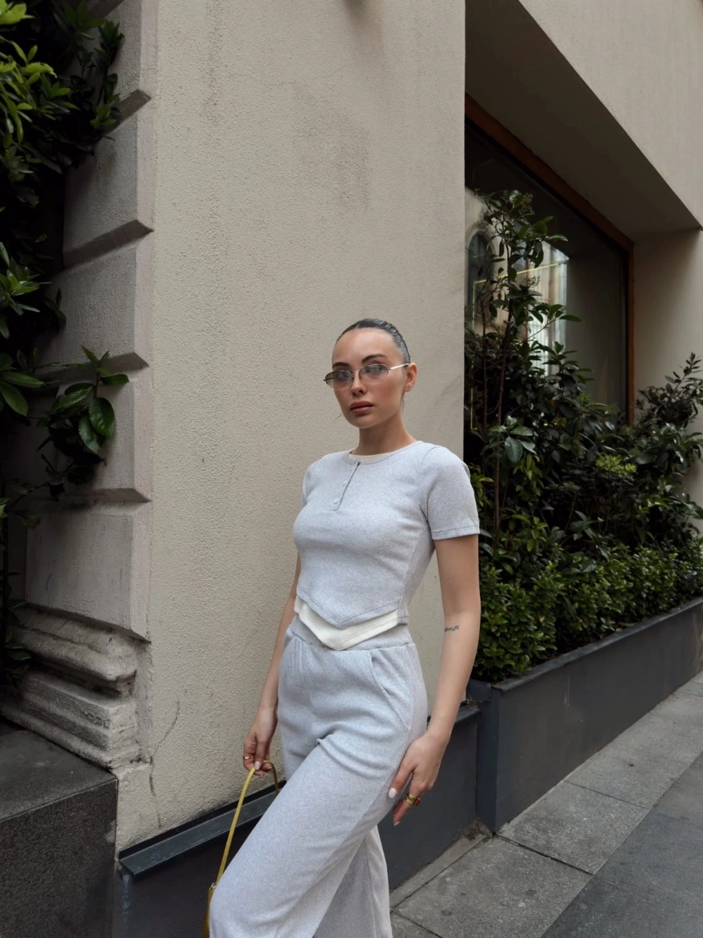 Şıklığı ve rahatlığı bir arada sunan Düğme Yakalı Gri Alt Üst Takım S3943, kadın giyim kategorisindeki favori tercihlerden biridir.