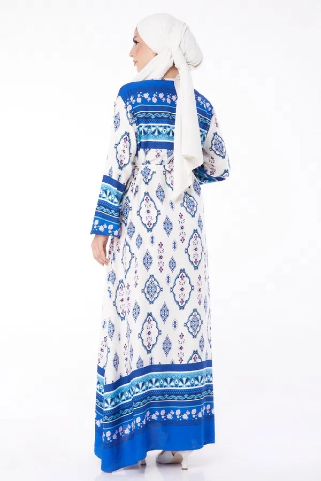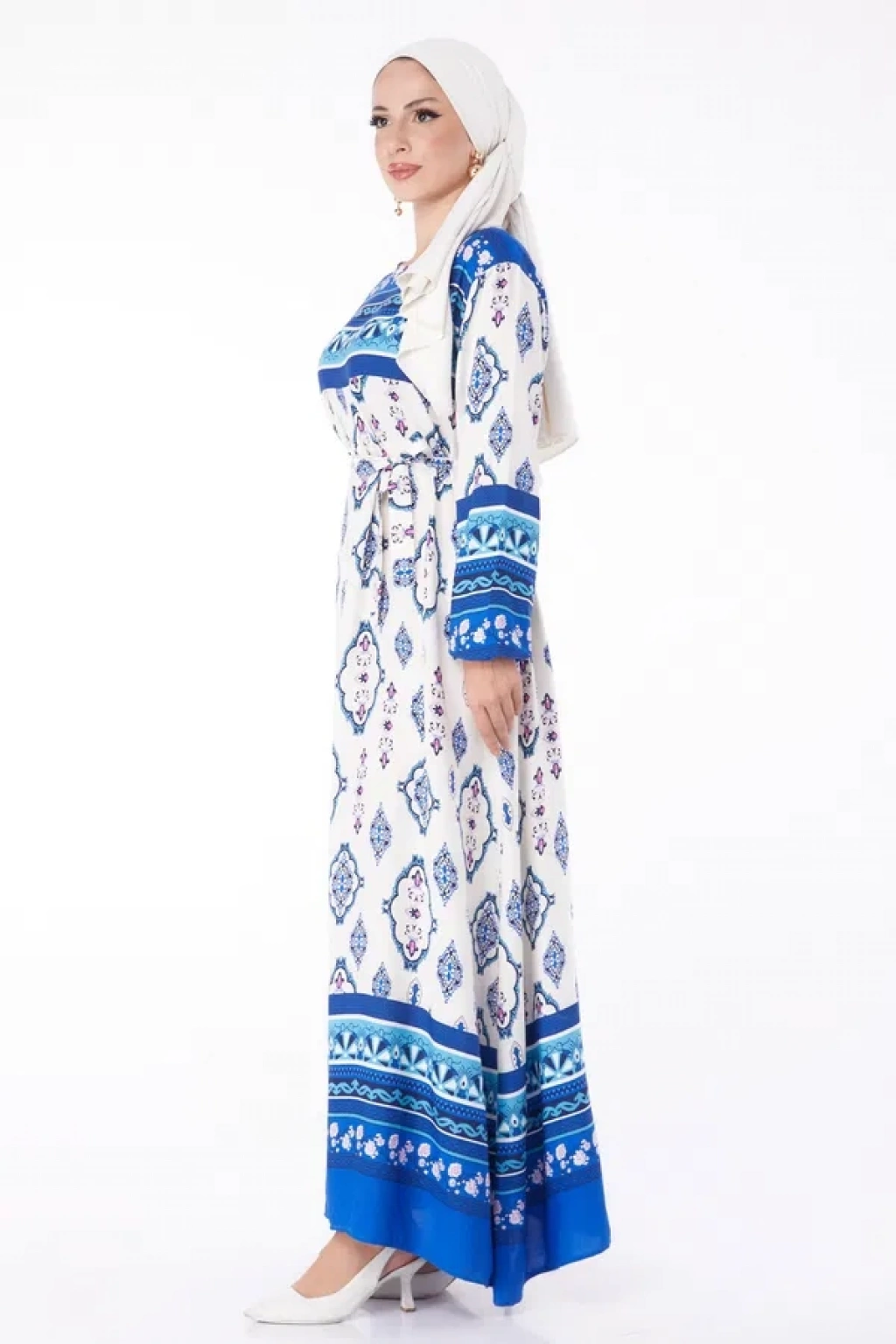 Düz Bisiklet Yaka Kadın Mavi Etnik Desenli Elbise, KAZAX marka kadın giyim sergimizunun şık ve rahat parçalarından biridir.