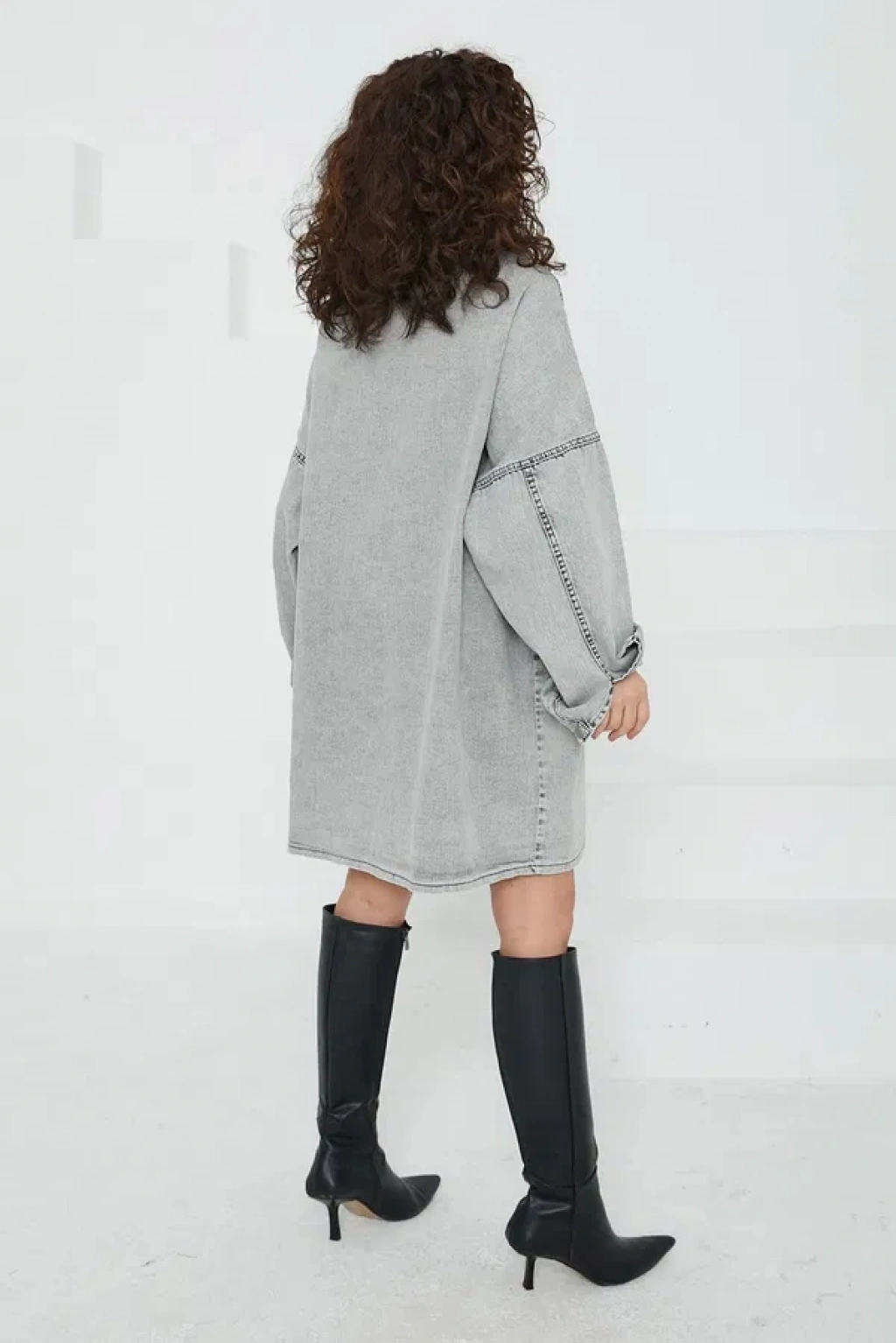 • Düz Gömlek Yaka Kadın Gri Kuş Gözü Cepli Kot Ceket
