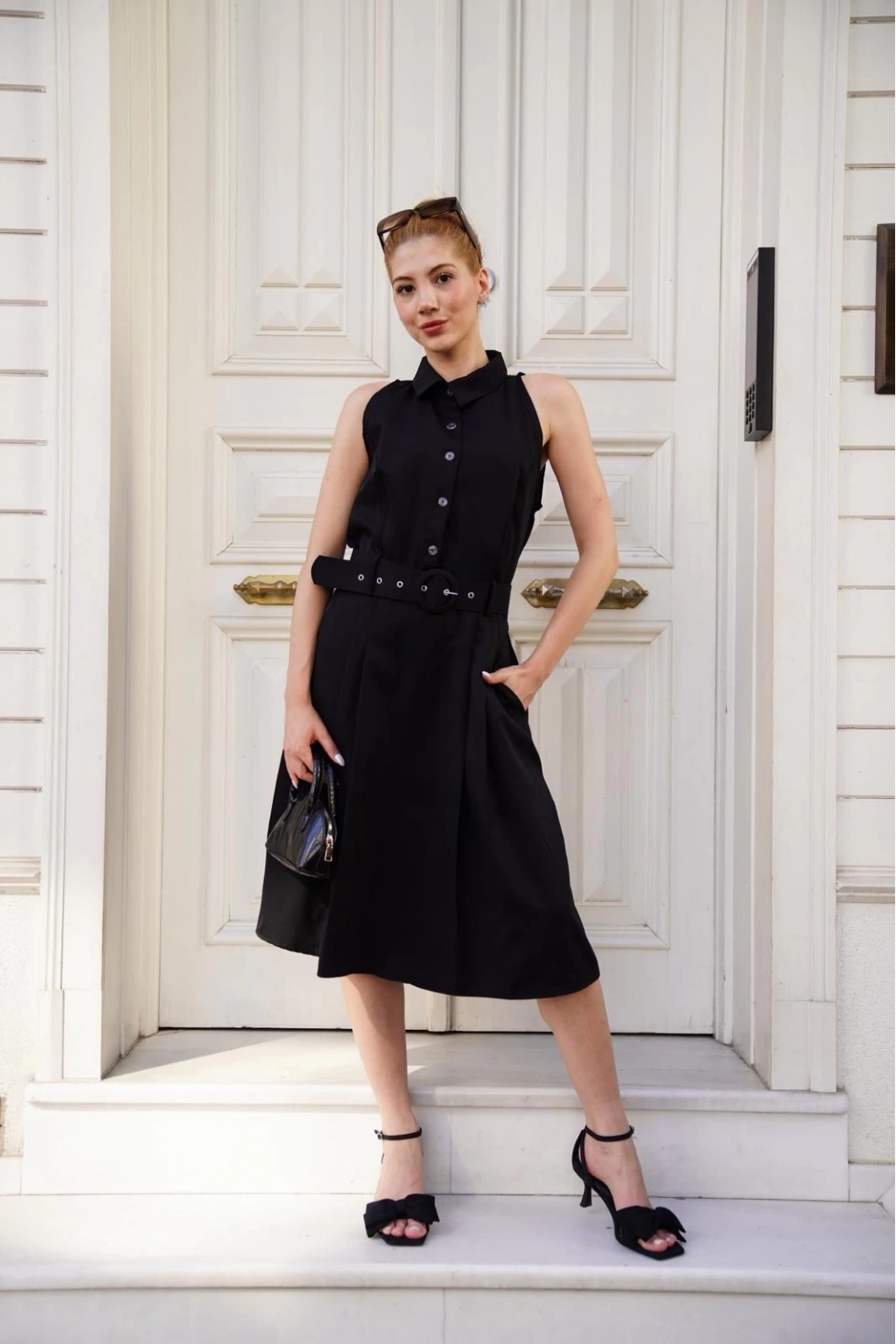 Gömlek yaka kemerli siyah elbise, gardırobunuzun vazgeçilmez parçası olmaya aday! Zarif tasarımıyla dikkat çeken bu elbise, şıklığı ve rahatlığı bir arada sunuyor. %100 pamuklu kumaşı sayesinde gün boyu konforu garantilerken, belindeki kemer detayıyla da feminen bir görünüm sağlıyor. Hem günlük hayatta hem de özel davetlerde rahatlıkla tercih edebileceğiniz bu elbise, şıklık konusunda sizi yalnız bırakmayacak.