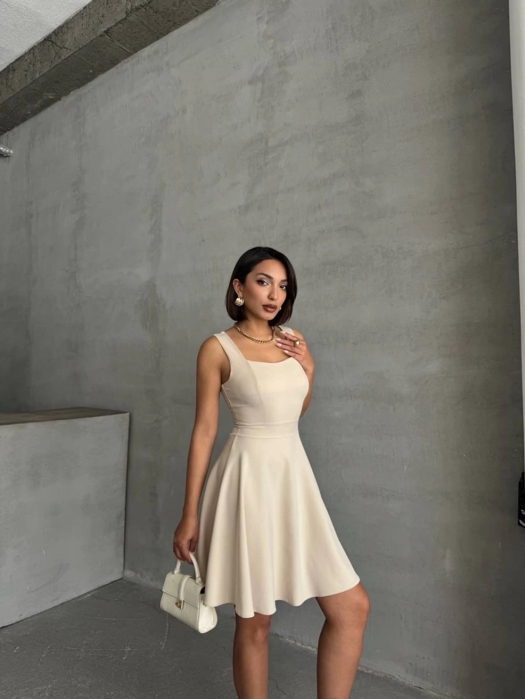 Şıklığı ve rahatlığı bir arada sunan Kadın Kare Yaka Kısa Elbise, gardırobunuzun vazgeçilmezi olmaya aday!