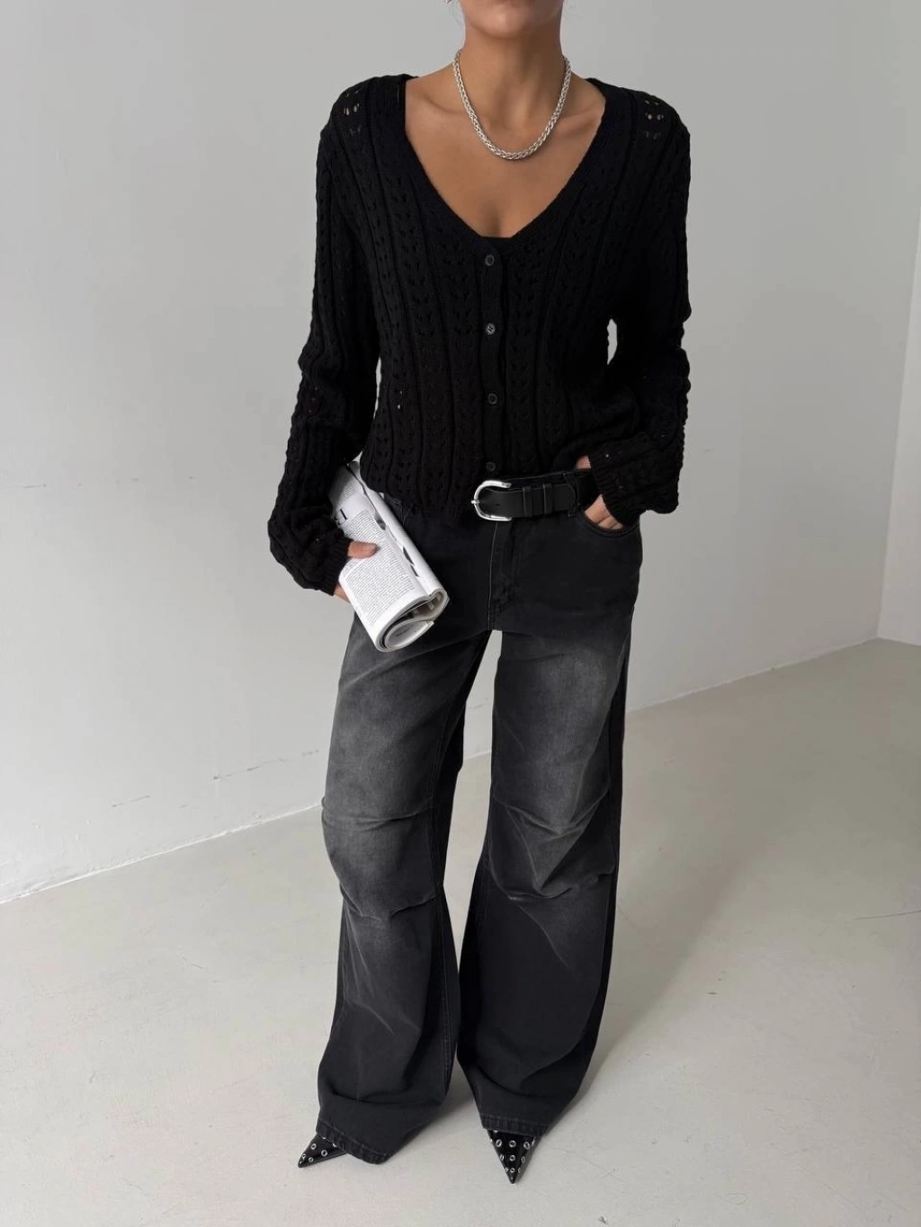 Küçük düğmeli küçük örgülü triko hırka siyah