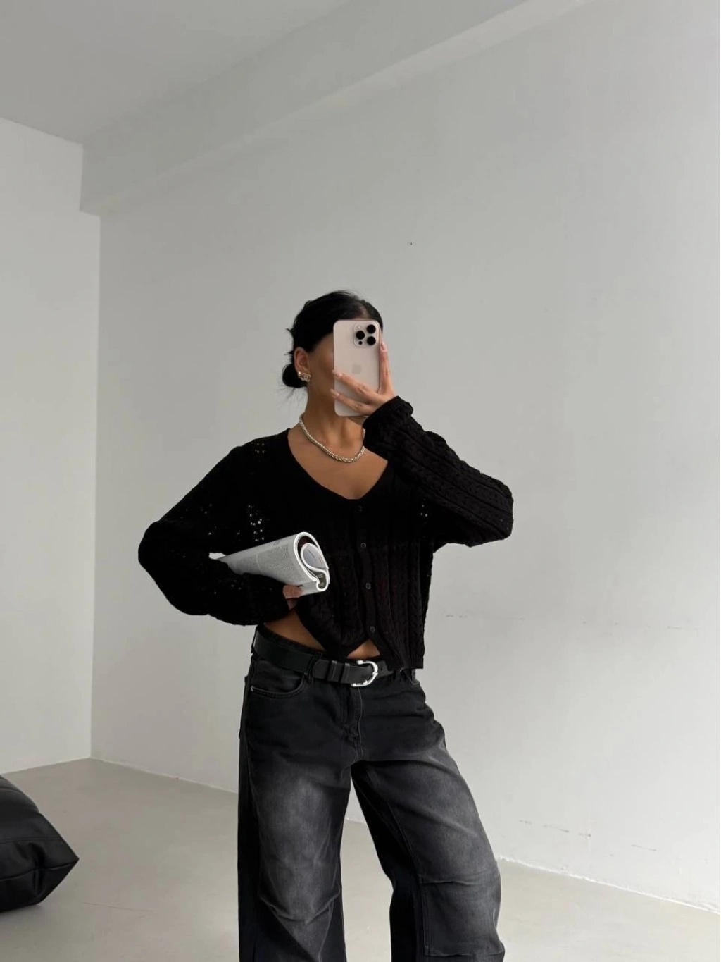 Küçük düğmeli küçük örgülü triko hırka siyah