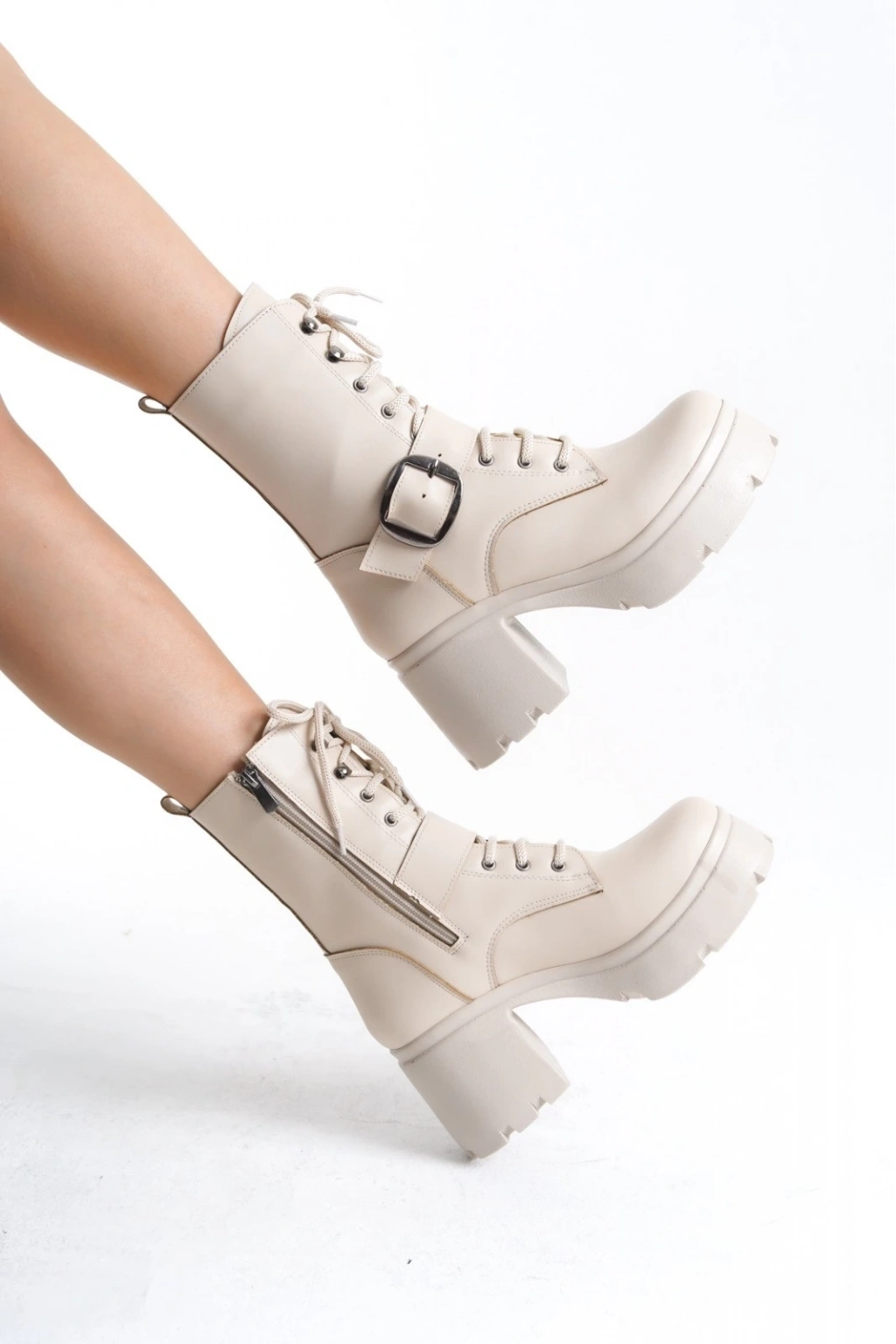 Linma Bej Cilt Bağcıklı Topuklu Bot