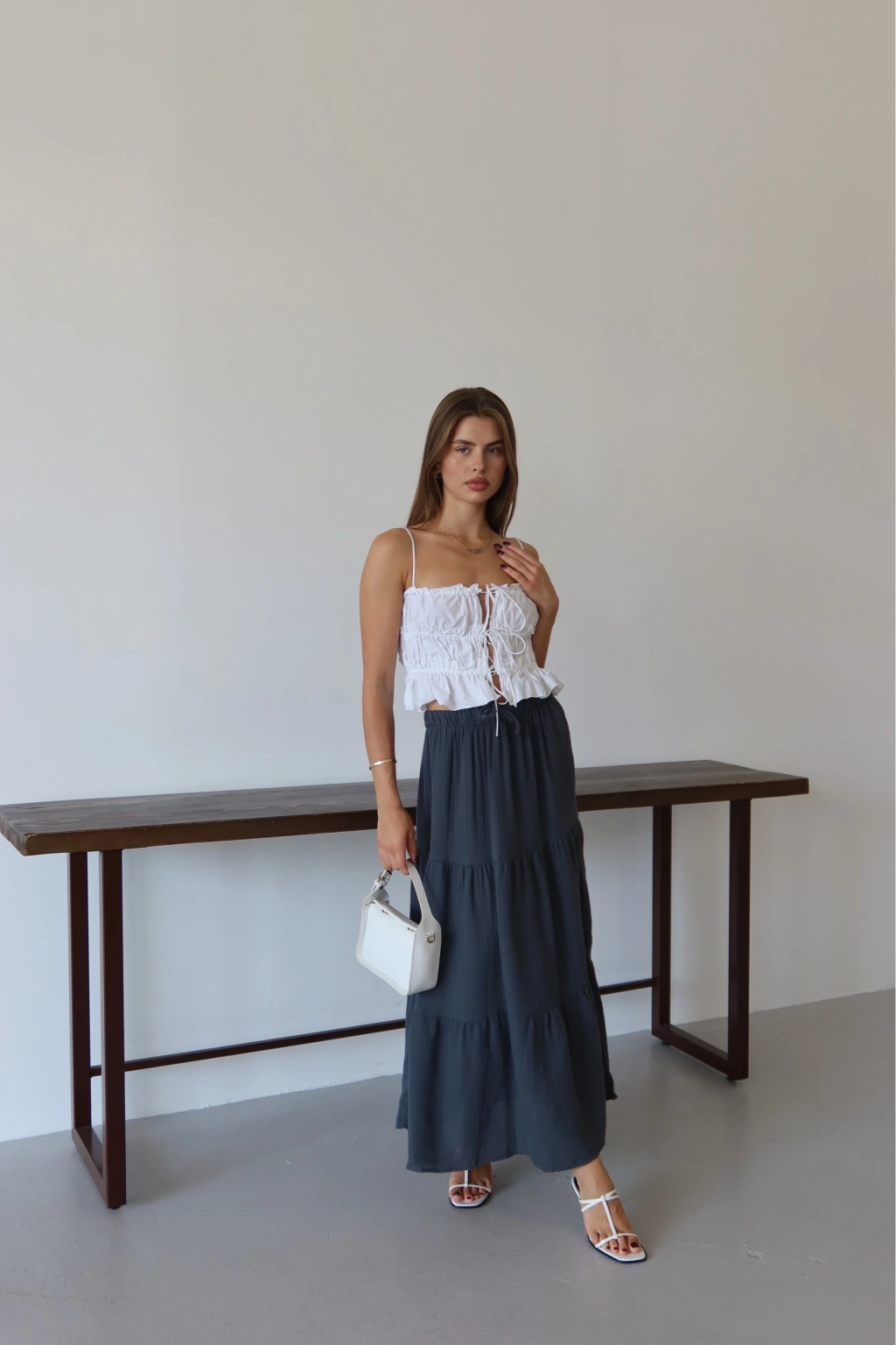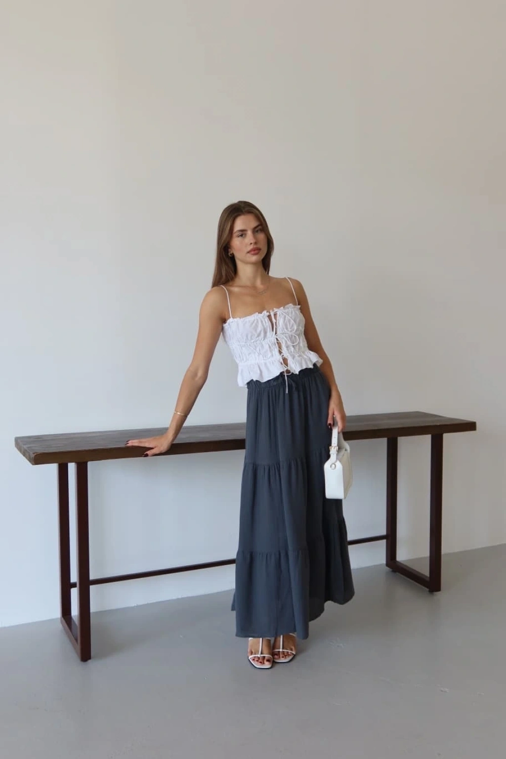 Yüksek kaliteli müslin ve keten karışımı ile üretilmiş uzun etek, gardırobunuzun vazgeçilmezi olmaya aday. Antrasit rengiyle şıklığı ve zarafeti bir arada sunan bu etek, her tarza kolaylıkla uyum sağlar. Rahat kesimi sayesinde gün boyu konfor sunarken, şık detaylarıyla da göz kamaştırır.