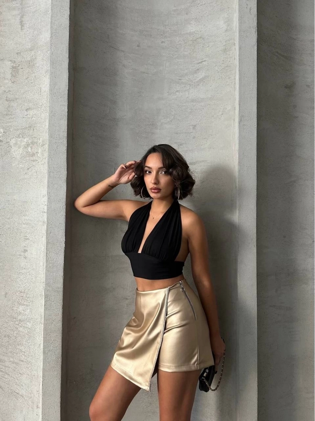 Şort etek modelleri arasında iddialı bir seçenek olan Taşlı Şort Etek Deri Gold H240018'i hemen sepetinize ekleyin!