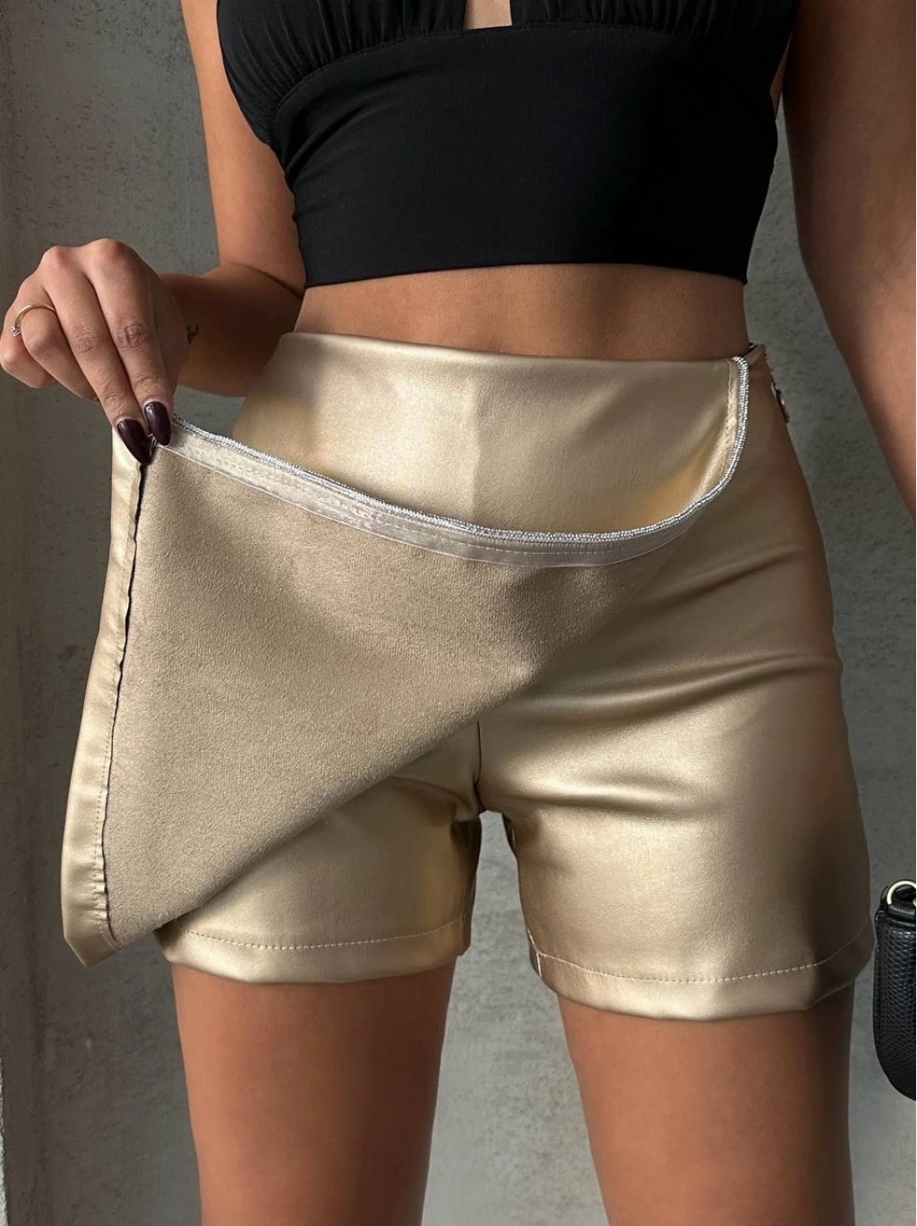 Şıklık ve rahatlığı bir arada sunan Taşlı Şort Etek Deri Gold H240018 ile tarzınızı konuşturun.
