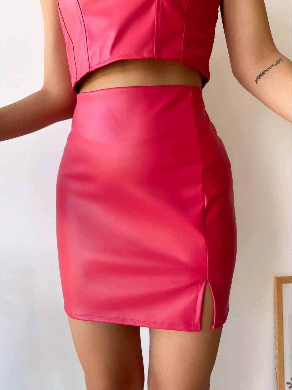 Tek yırtmaçlı arkadan fermuarlı deri etek fuşya s24475