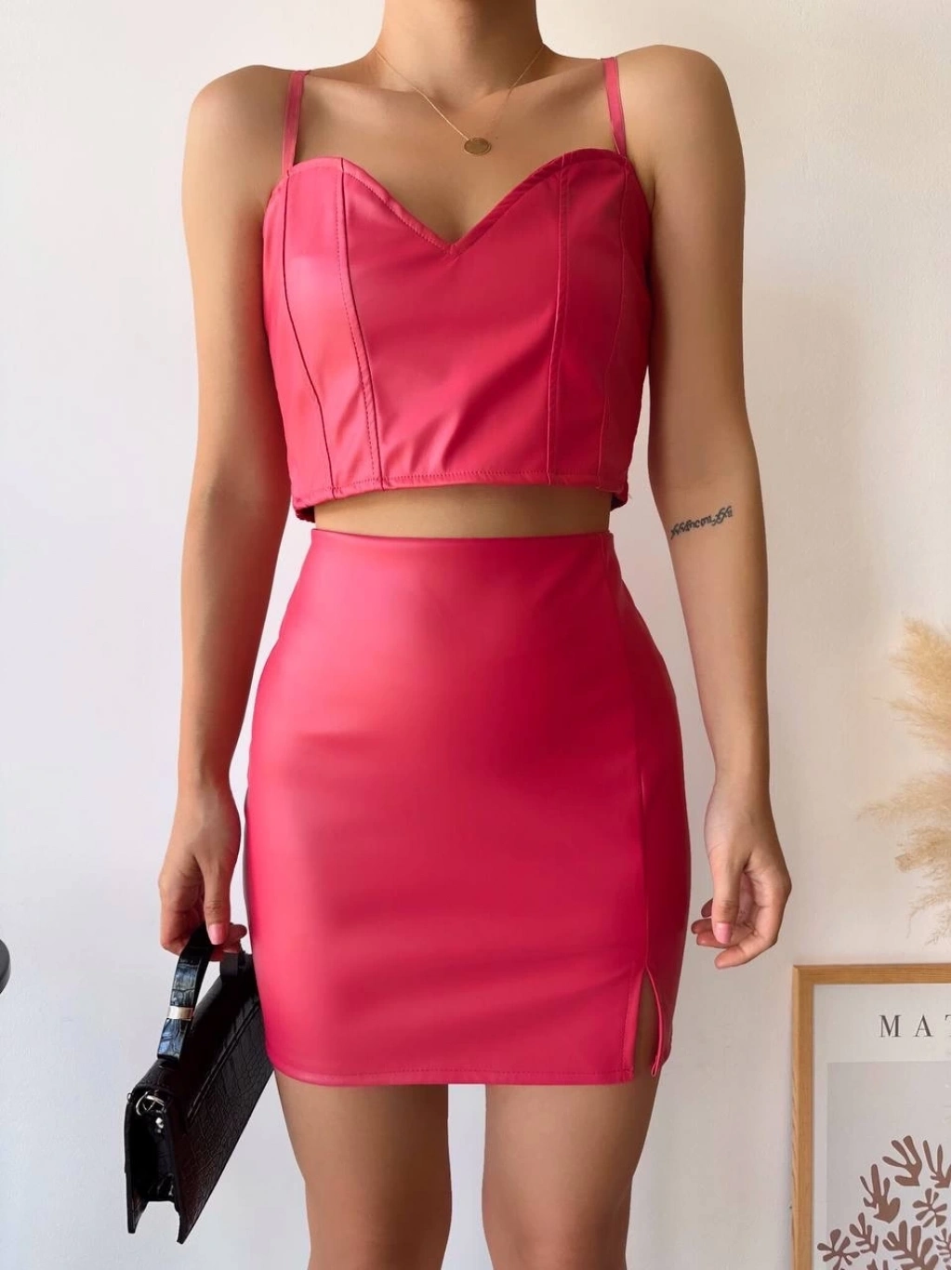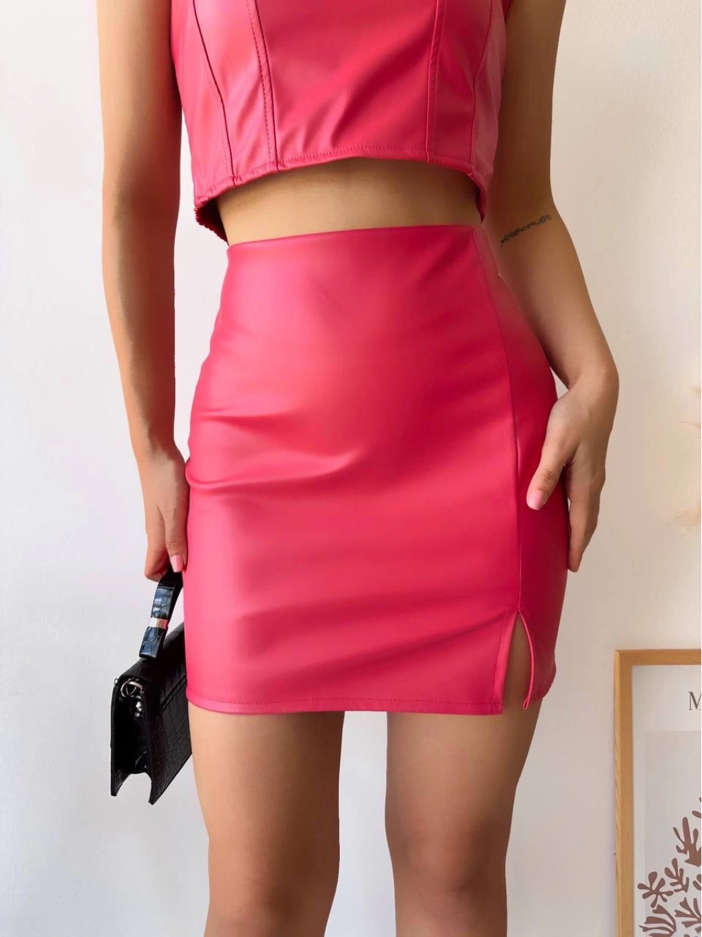 Şıklığı ve zarafeti bir arada sunan Tek Yırtmaçlı Arkadan Fermuarlı Deri Etek Fuşya S24475, gardırobunuzun vazgeçilmez parçalarından biri olmaya aday!