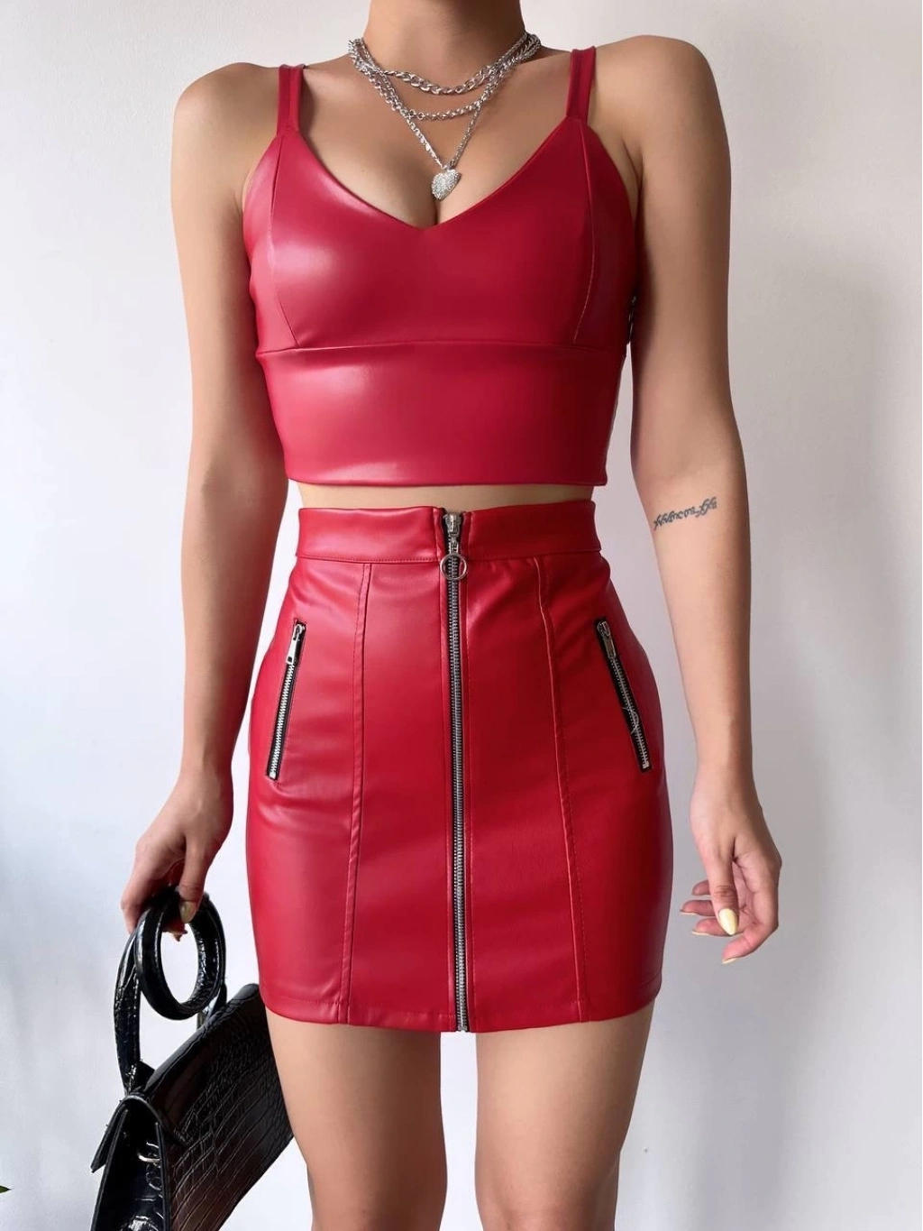Üç fermuarlı deri etek bordo S24510, şık ve modern bir görünüm elde etmek isteyen kadınların tercihi olacaktır. Gardırobunuzun vazgeçilmez parçalarından biri olmaya aday!