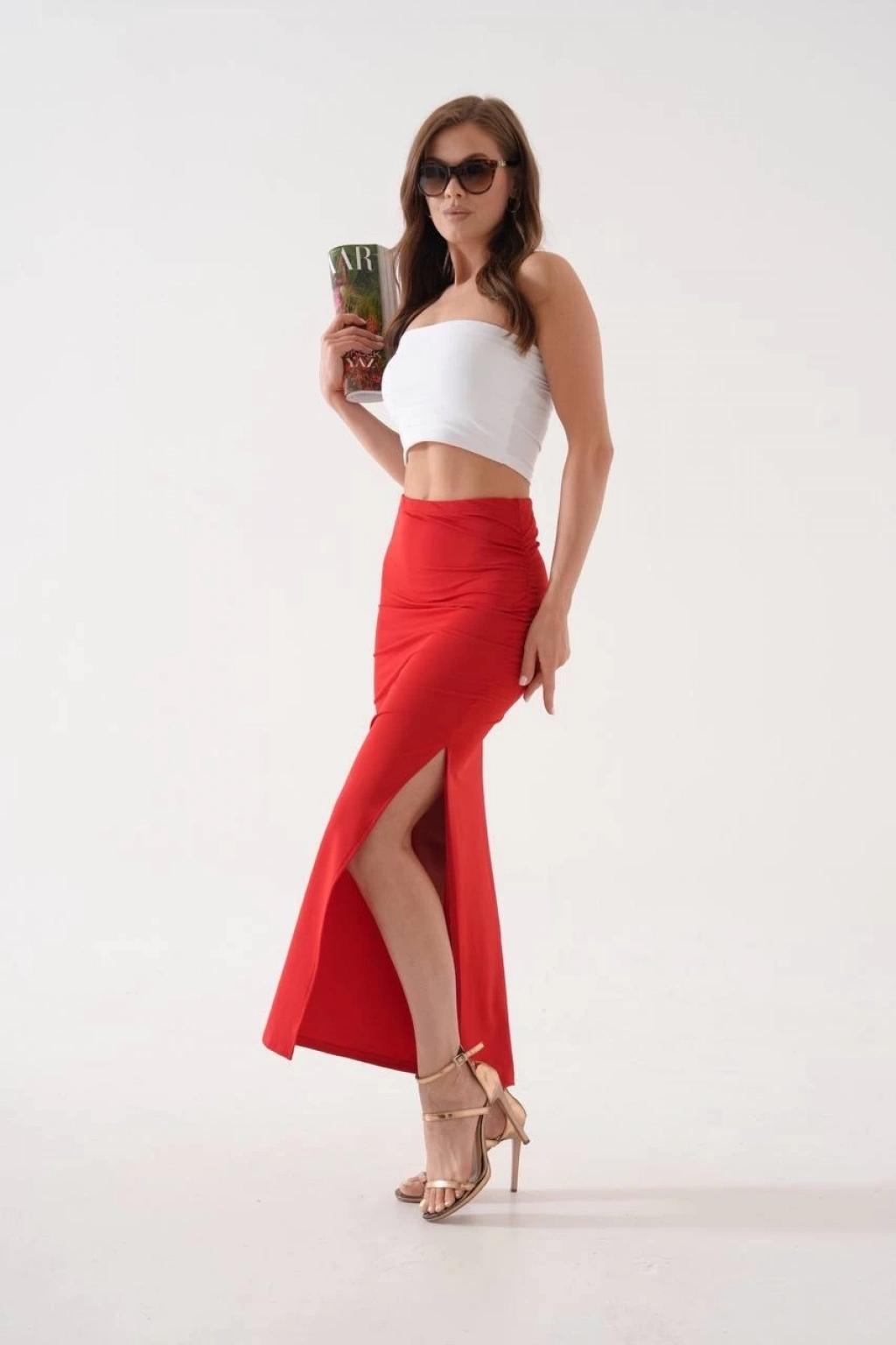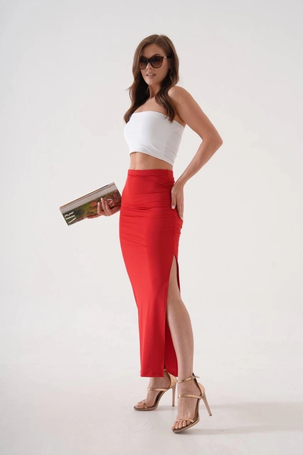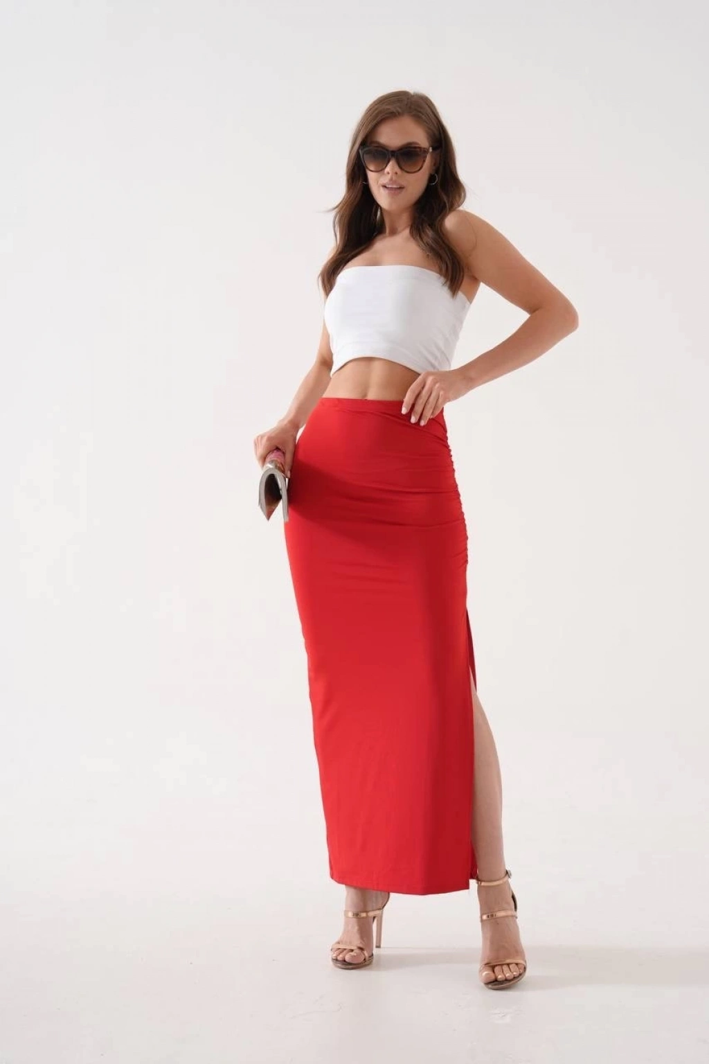 Uzun yırtmaçlı ince kumaş etek kırmızı