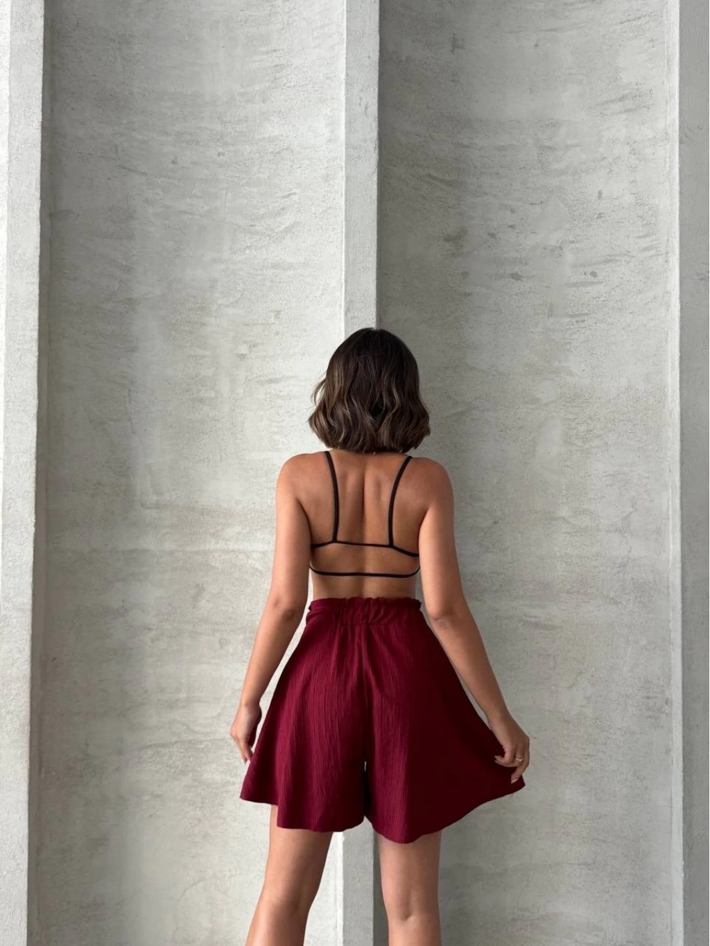 Volanlı keten şort bordo s255058, yaz aylarında şıklığından ödün vermek istemeyen kadınlar için ideal bir seçenektir. İnce ve hafif keten kumaşı sayesinde gün boyu konfor sunar.