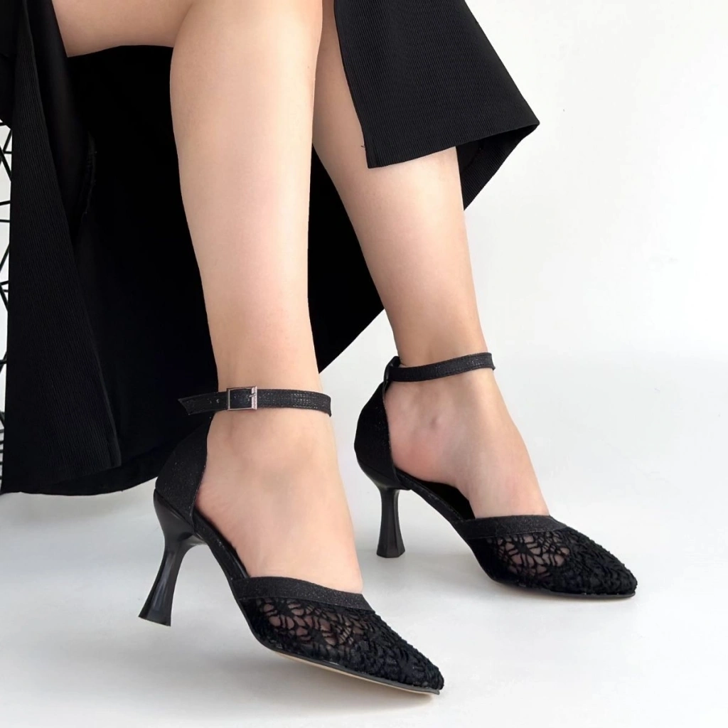 Weja Siyah Cilt Tül Detaylı Topuklu Ayakkabı