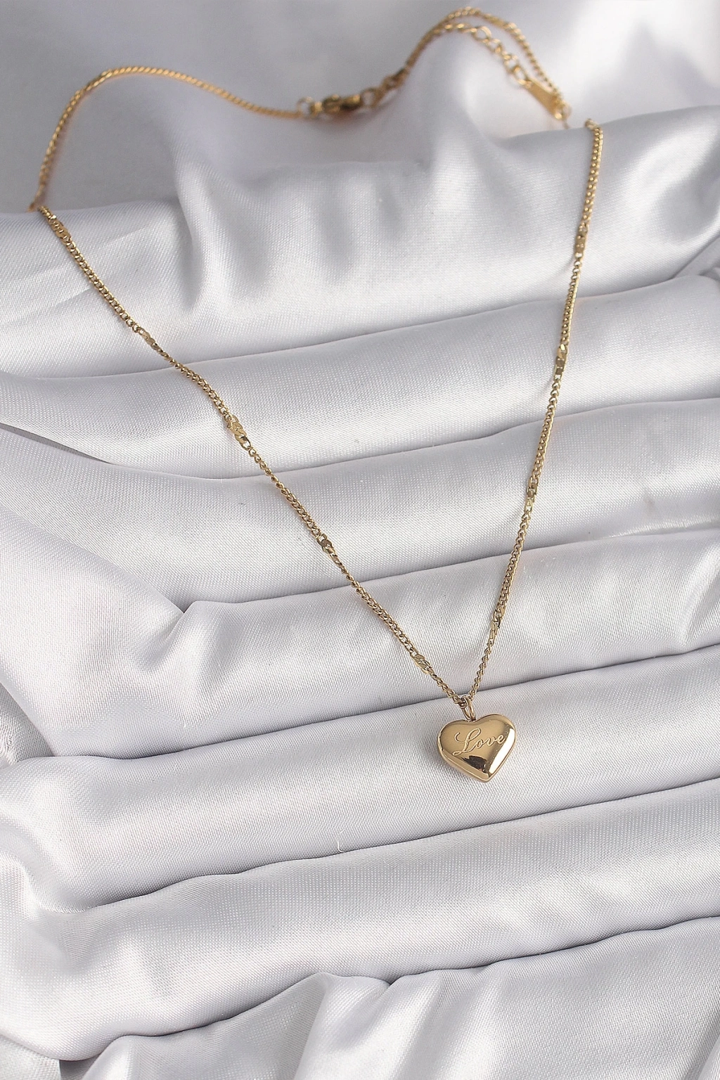 ® 316L Çelik Gold Renk Zincir Love İşlemeli Kalp Figür Kadın Kolye