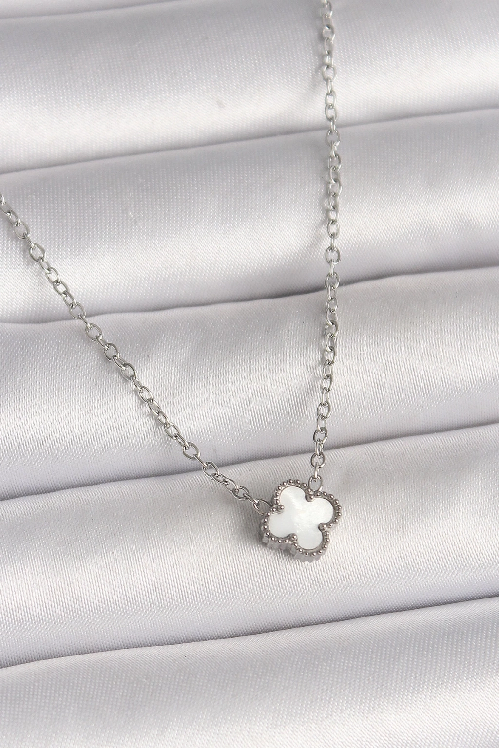 ® 316L Çelik Gümüş Renk Beyaz Yonca Model Kadın Kolye