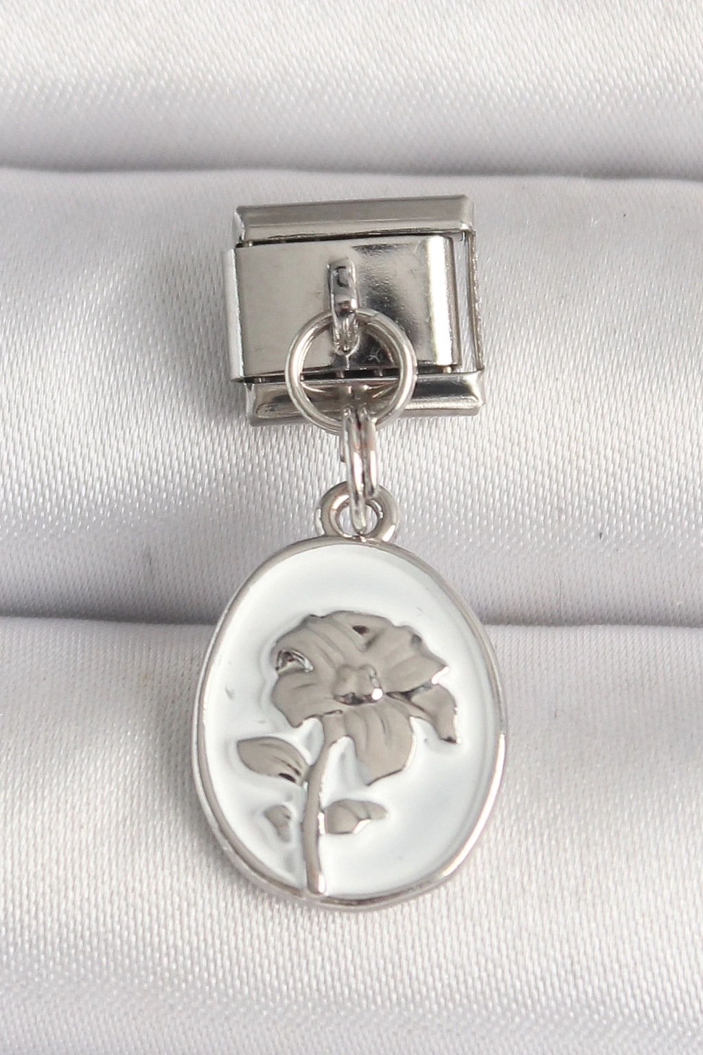 ® 316L Çelik Gümüş Renk Çiçek İşlemeli Beyaz Portre Model Nomination Charm
