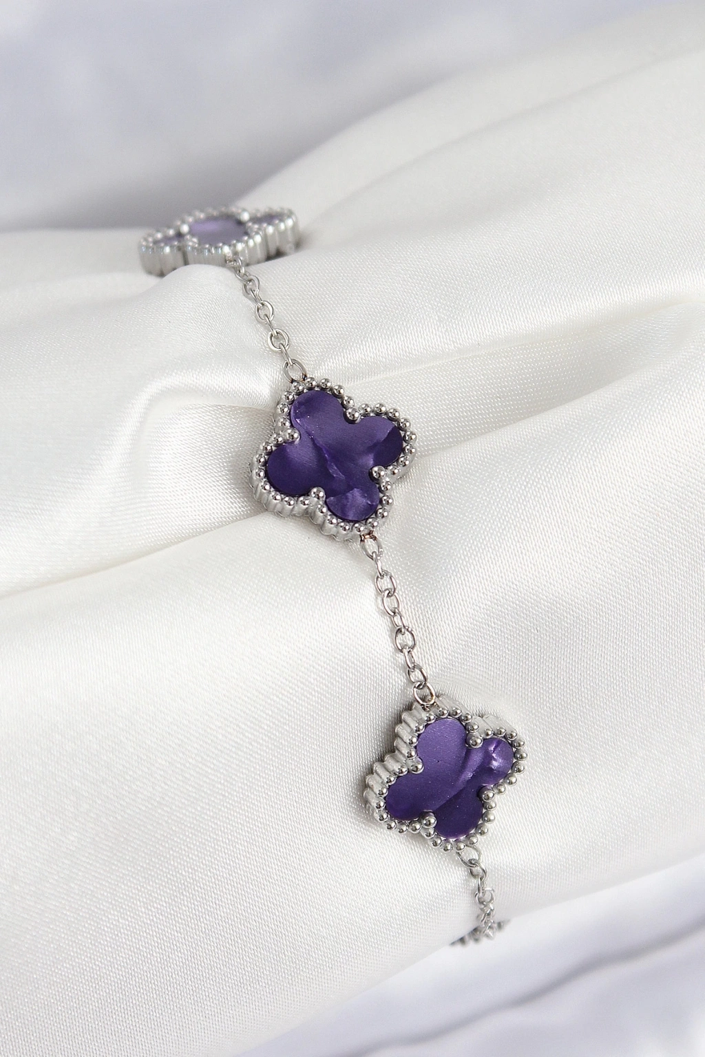 ® 316L Çelik Sedefli Mor Gümüş Renk Yonca Kadın Bileklik