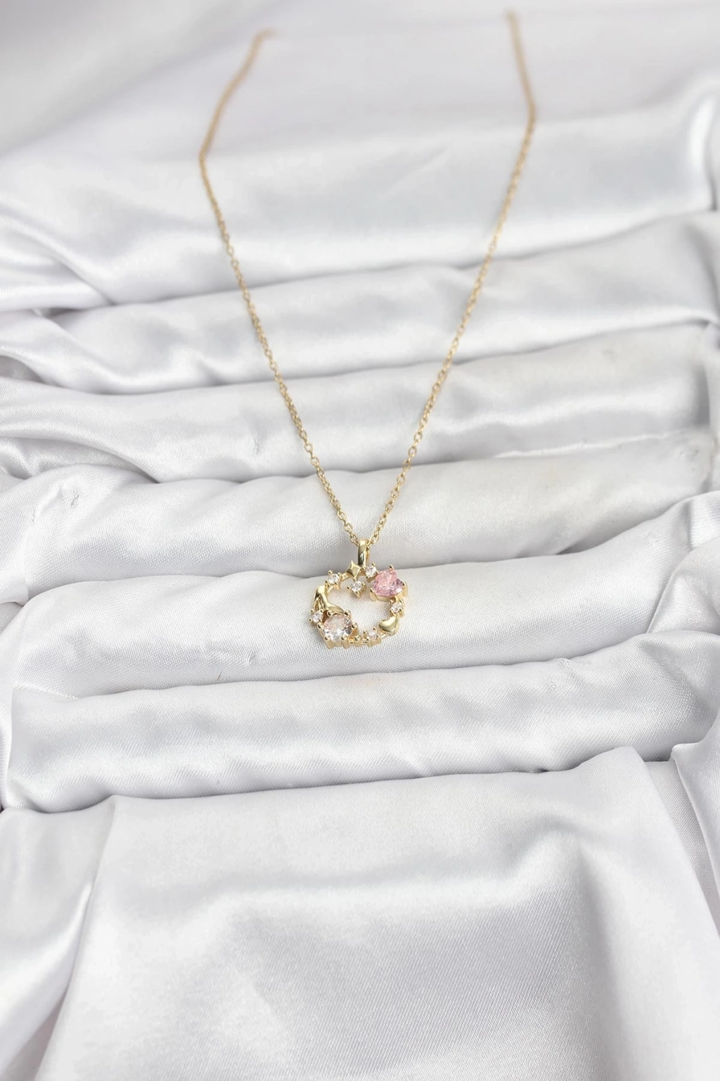® 316L Çelik Zincir Gold Renk Pembe Taş Detaylı Çelenk Model Kadın Kolye