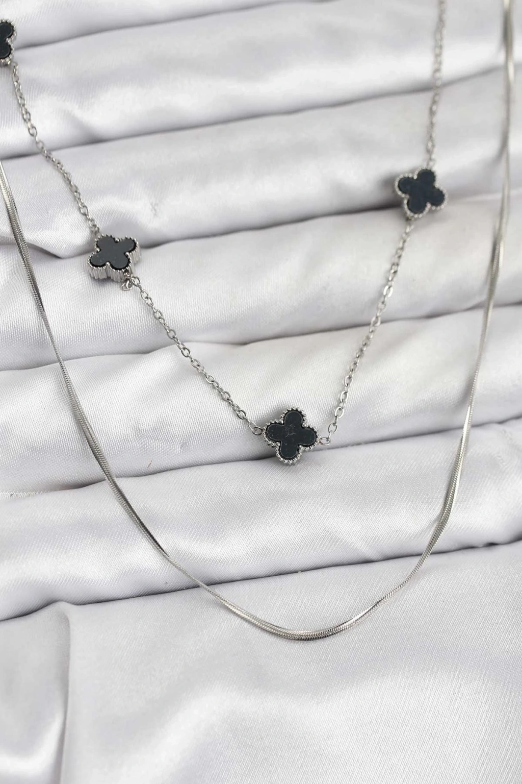 ® 316L Çelik Zincir Gümüş Renk İtalyan Zincirli Siyah Yonca Model Kadın Kolye