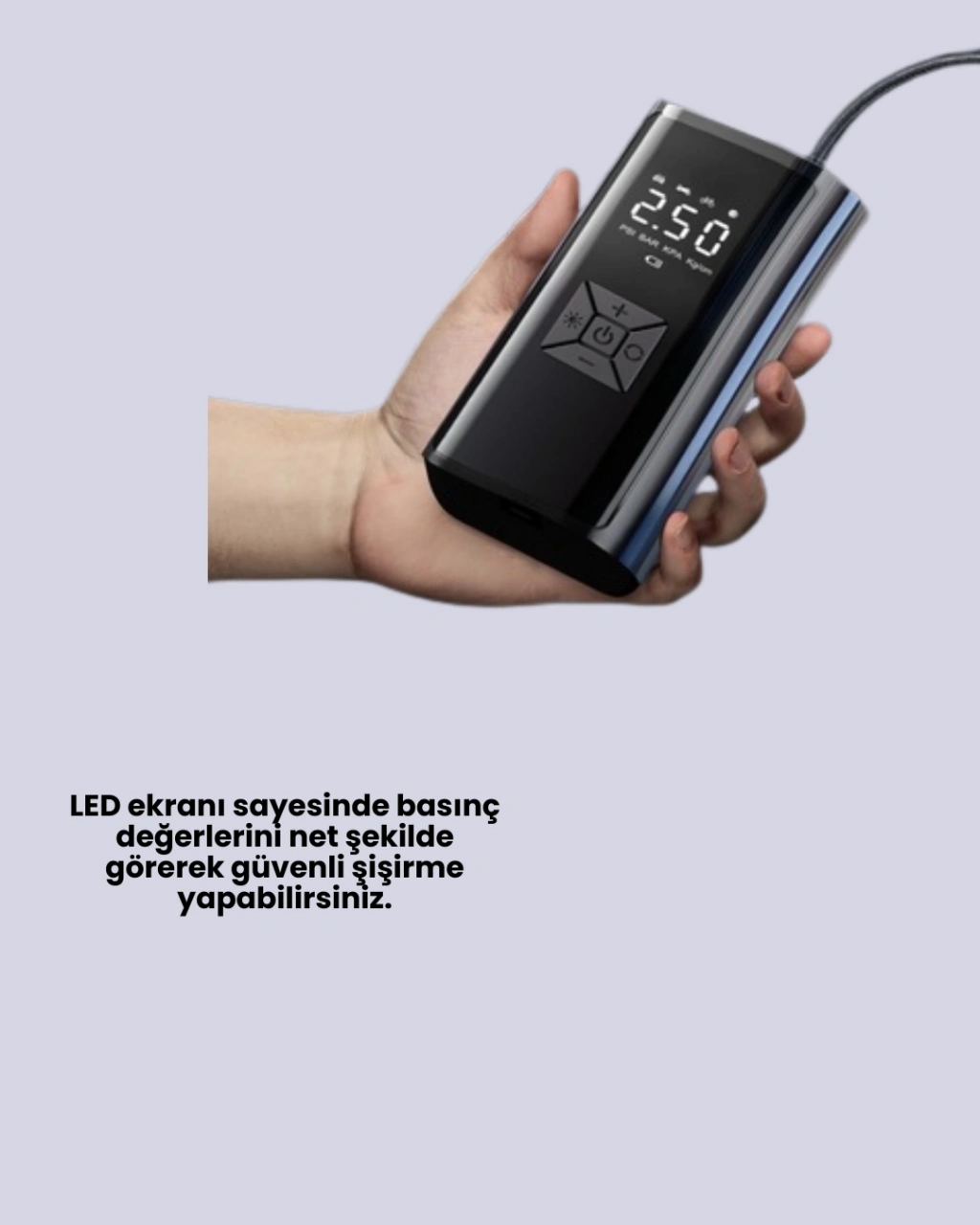 Kablosuz taşınabilir lastik şişirme pompası, sürücüler için güvenliği ve pratikliği bir araya getirir. 80W gücündeki motoru sayesinde hızlı şişirme yapabilen bu cihaz, arabalar, motosikletler, bisikletler ve toplar için uygundur. Kompakt ve hafif yapısı ile aracınızda, çantanızda veya garajınızda kolayca saklanabilir.Dijital ekranlı kontrol paneli, basınç değerlerini net şekilde görüntülemenizi sağlar. Önceden ayarlanan değere ulaşıldığında cihaz otomatik olarak durur, böylece fazla şişirme riskini ortadan kaldırır. Dört farklı mod seçeneği ile ihtiyacınıza uygun kullanım sunar.LED aydınlatma fonksiyonu sayesinde gece veya düşük ışıkta güvenli kullanım mümkündür. Ayrıca SOS yardım ışığı, acil durumlarda dikkat çekmenize yardımcı olur. Dayanıklı gövdesi, naylon örgü güçlendirmesi ile uzun ömürlüdür.12V uyumlu bu cihaz, kablosuz kullanımıyla kablo karmaşasına son verir. Kamp, tatil veya uzun yolculuklarda yanınızda taşıyarak her an güvenle kullanabilirsiniz.