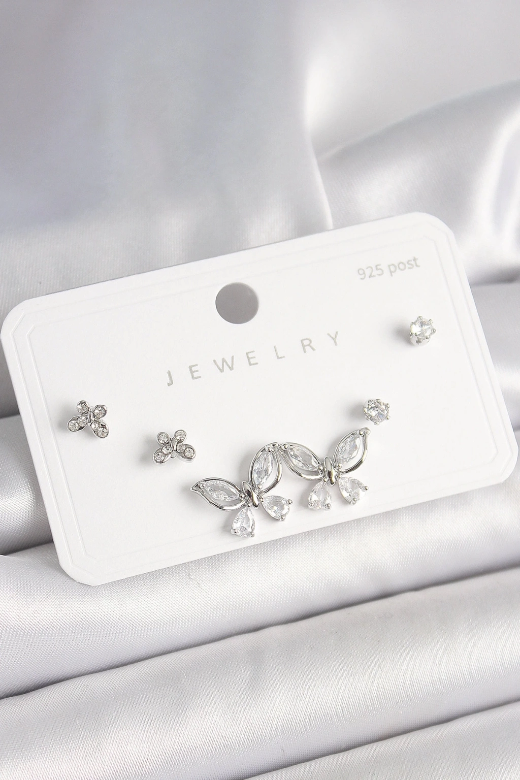 ® 925 Ayar Gümüş Çivi Pirinç Gümüş Renk Zirkon Taşlı Kelebek Model Kadın Küpe Seti