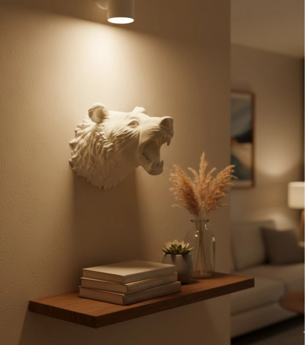 Beyaz 3D ayı başı duvar heykeli, dekorasyonuna modern, etkileyici ve güçlü bir dokunuş eklemek isteyenler için özel olarak tasarlanmış bir üründür. 25x19 cm ölçülerindeki bu dekoratif figür, beyaz renginin sadeliği ve şıklığı ile hem modern hem de minimal dekorasyon tarzlarına mükemmel uyum sağlar. Ürünün detaylı yüz hatları dikkat çekici bir gerçekçilik sunarken, 3 boyutlu kabartı yapısı duvarda güçlü bir gölge etkisi oluşturur.Hafif ve sağlam yapısı sayesinde kolayca duvara monte edilebilir. Odanın odak noktası olması için tek başına kullanılabileceği gibi, galeriler, çalışma odaları, genç odaları, ofisler veya tasarım ağırlıklı ortamlar için de harika bir tamamlayıcıdır. Ayı figürü; güç, cesaret ve koruyucu enerji ile ilişkilendirildiği için manevi anlamda bir sembol arayan kullanıcıların da ilk tercihleri arasında yer alır.Estetik tasarımı sayesinde fotoğraf çekimleri, video çekim alanları, stüdyo dekorasyonları veya mağaza vitrinlerinde de çok şık bir görünüm sağlar. Beyaz rengi, her renkteki duvar ile uyumlu olduğu için dekorasyon seçeneklerini genişletir.Ayrıca özel günler için benzersiz bir hediye seçeneğidir. Şık, farklı ve anlamı olan dekoratif objeler sevenler için ideal bir alternatiftir.