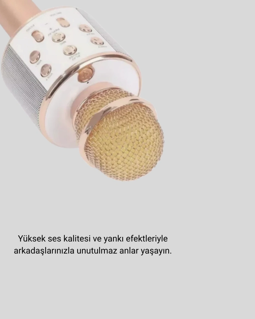 Evinizi eğlence dolu bir konser alanına dönüştürmek için tasarlanan bu karaoke mikrofonu, yüksek ses kalitesi ve çok yönlü kullanım özellikleriyle tüm özel anlarınızı unutulmaz hale getirir. USB ve AUX girişleri sayesinde dilediğiniz cihazla uyumlu bir şekilde çalışır. Bluetooth bağlantı özelliği kablosuz özgürlük sunarak hem pratik hem de keyifli bir kullanım sağlar. Telefon, tablet, bilgisayar veya müzik çalarlara kolayca bağlanabilir, dilediğiniz şarkıyı anında söylemeye başlayabilirsiniz.Yüksek ses çıkışı ve profesyonel seviyede yankı efektleri, vokal kalitenizi artırarak gerçek bir sahne hissi yaşatır. Hem yetişkinler hem çocuklar için eğlenceyi ikiye katlayan bu mikrofon, oyun, parti, doğum günü, aile etkinlikleri ve arkadaş buluşmaları için ideal bir seçimdir. Dahili şarj edilebilir pili uzun pil ömrü sunar ve saatlerce kesintisiz kullanım sağlar. Ayrıca şarj ederken bile performansı düşmeden kullanıma devam edilebilir.Cihazın ergonomik tasarımı elinizde rahat kavranır ve uzun süre kullanımda rahatlık sağlar. Şık ve modern tasarımıyla hem dekoratif hem fonksiyonel bir üründür. Ölçüleri 25 x 9,5 x 8,5 cm olan bu mikrofon, kompakt ve taşınabilir yapısıyla her yere rahatlıkla götürülebilir. Tatillerde, pikniklerde veya dış mekan etkinliklerinde eğlenceyi yanınızda taşıyabilirsiniz.Karaoke tutkunları için harika bir hediye seçeneği olan bu ürün, çocukların ses keşfi için de eğlenceli bir araçtır. Kendi sesinizi kaydedebilir, şarkılarla birlikte söyleyebilir ve arkadaşlarınızla yarışmalar düzenleyebilirsiniz. Üstün ses performansı, uzun pil ömrü ve çok fonksiyonlu yapısıyla bu karaoke mikrofonu; eğlenceyi seven herkes için vazgeçilmez bir üründür.