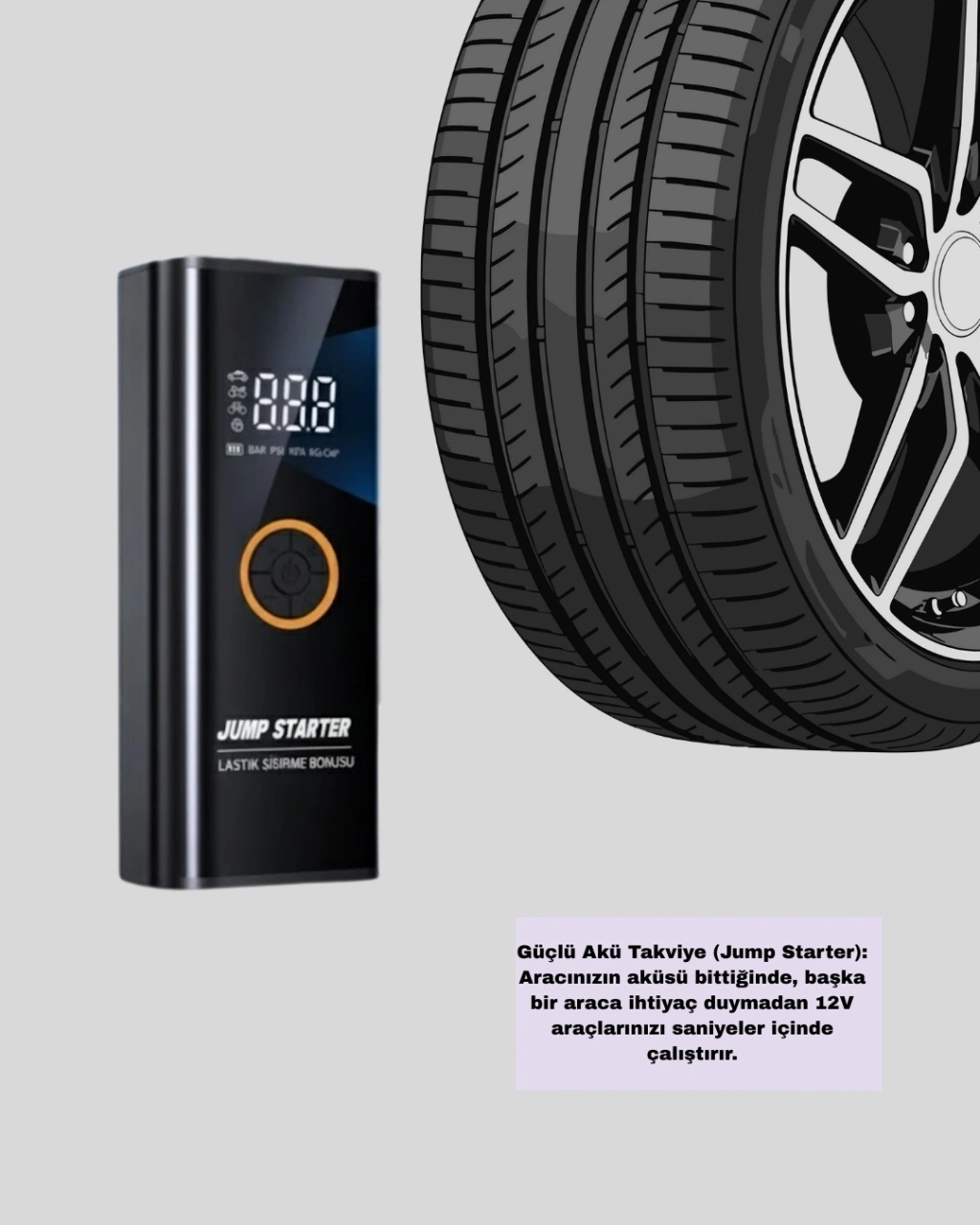 Sürüş güvenliğini artırmak ve acil durumlarda pratik çözümler sunmak amacıyla tasarlanan bu cihaz, birden fazla işlevi tek gövdede birleştirir. Akü takviye, dijital kompresör, LED fener ve powerbank özellikleri ile araç sahiplerinin ihtiyaç duyduğu temel çözümleri sunar.Akü takviye fonksiyonu sayesinde 12V araçlar hızlı şekilde çalıştırılabilir. Dijital hava kompresörü, 150 PSI’a kadar basınç desteği sunarak lastik şişirme işlemlerini kısa sürede tamamlar. Dijital ekran üzerinden basınç takibi yapılabilir ve otomatik durdurma özelliği güvenli kullanım sağlar.LED aydınlatma sistemi, karanlık ortamlarda kullanım kolaylığı sağlarken SOS modu ile acil durumlarda fark edilmenize yardımcı olur. Powerbank özelliği sayesinde mobil cihazlarınızı her an şarj edebilirsiniz.Kompakt, dayanıklı ve çok fonksiyonlu yapısıyla bu ürün; araç sahipleri için vazgeçilmez bir yol yardım çözümüdür.