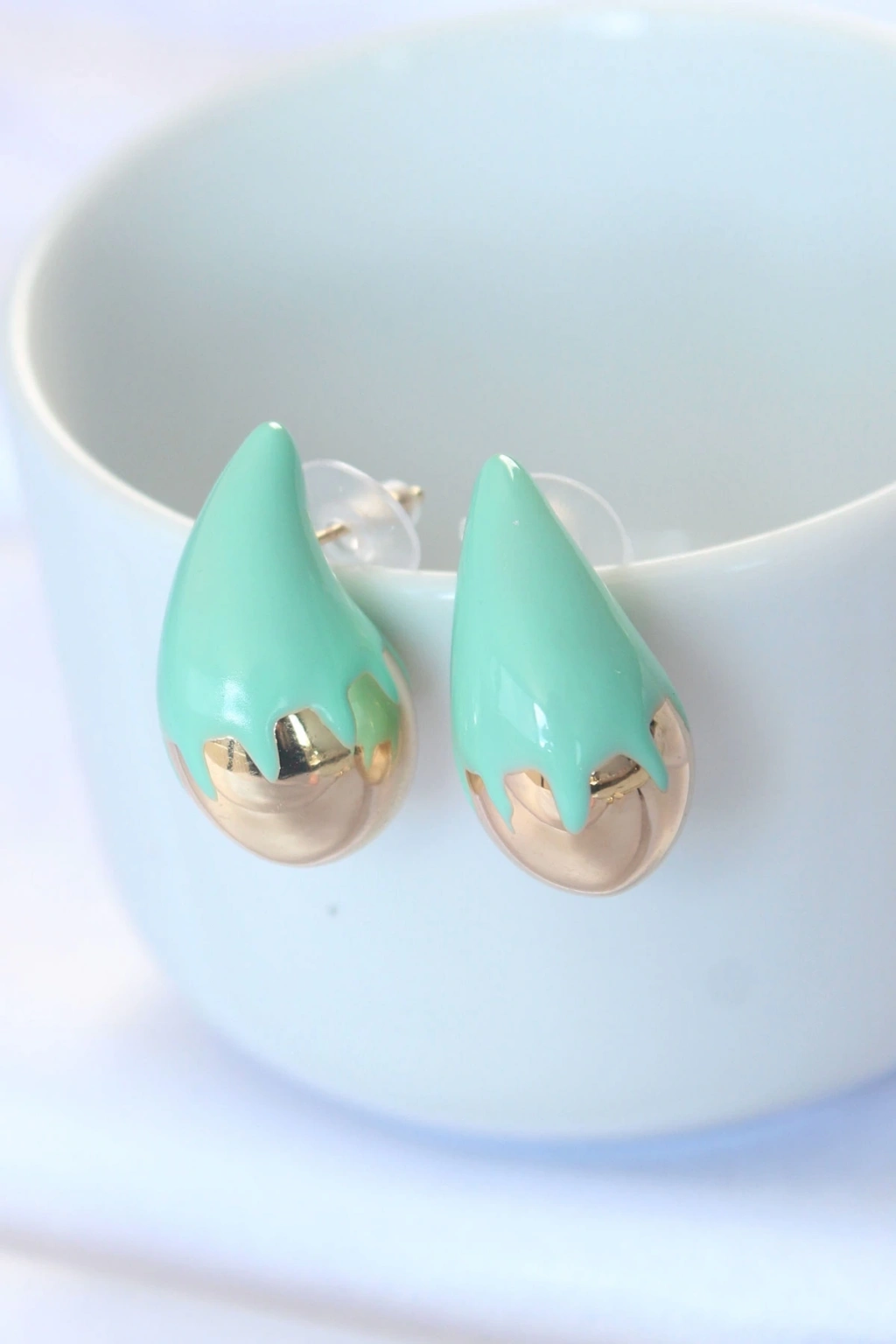 ® Minimal Turkuaz Mineli Çift Renk Damla Küpe