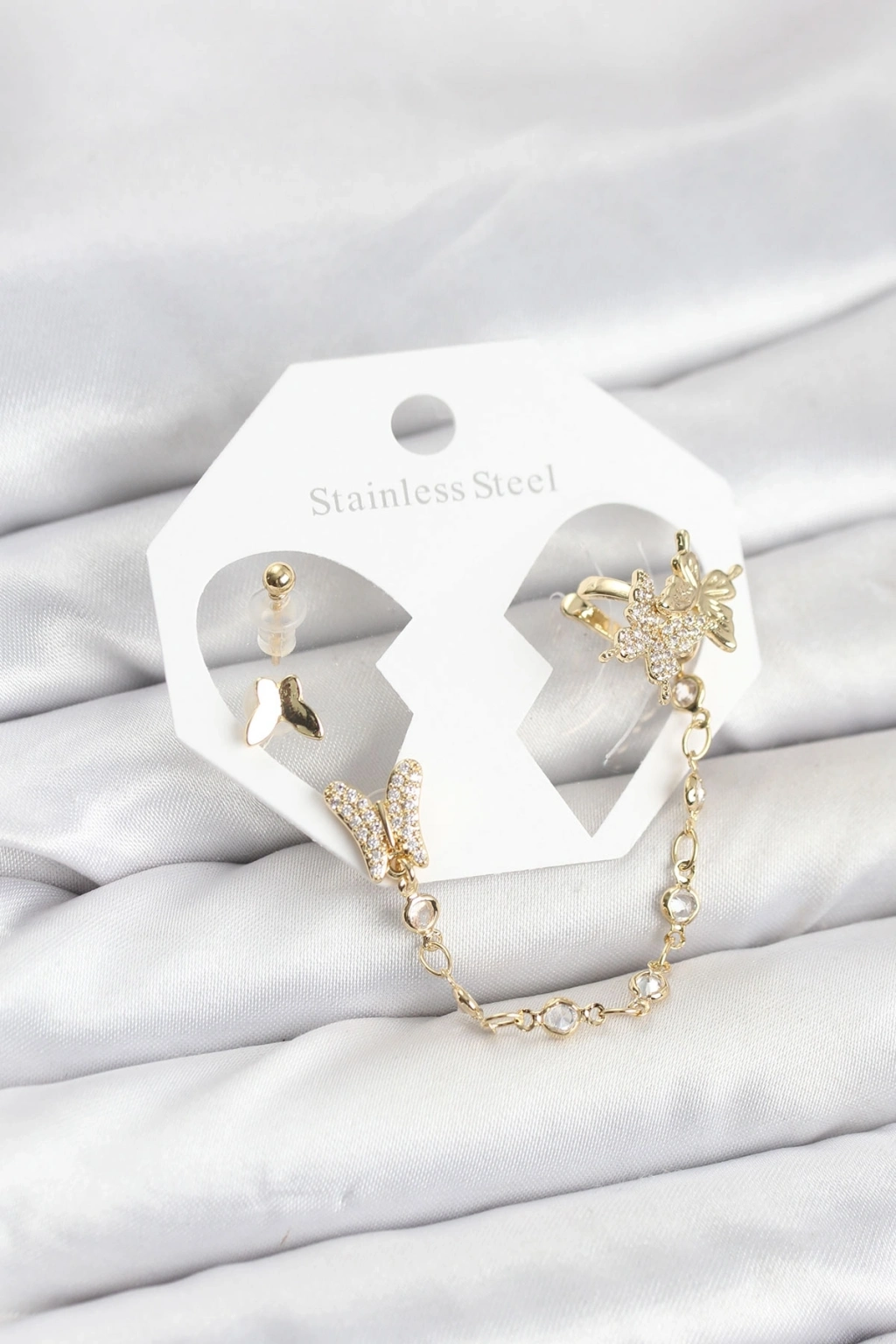 ® Pirinç Gold Renk Kelebek Model Zincir Bağlantılı Ear Cuff Küpe Seti
